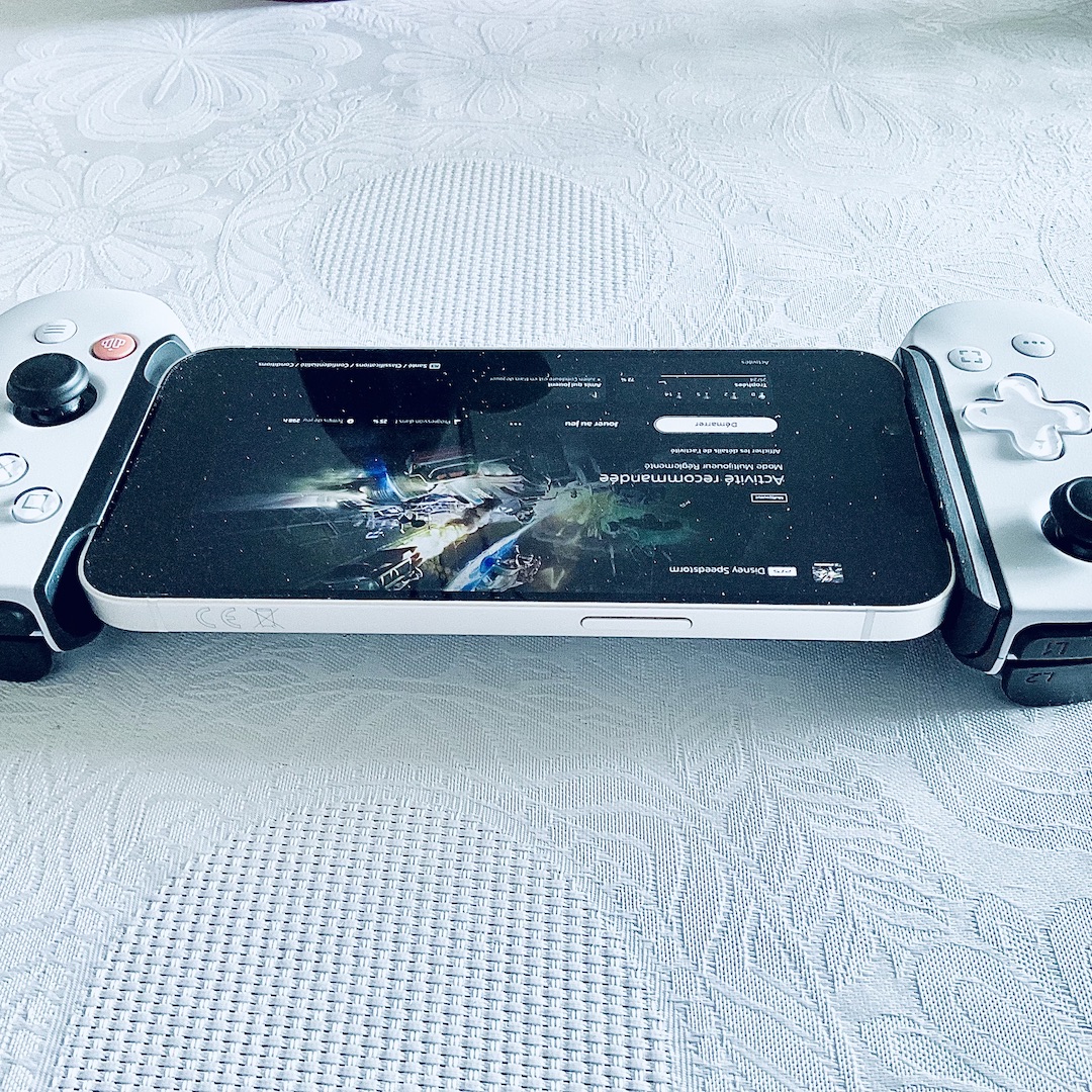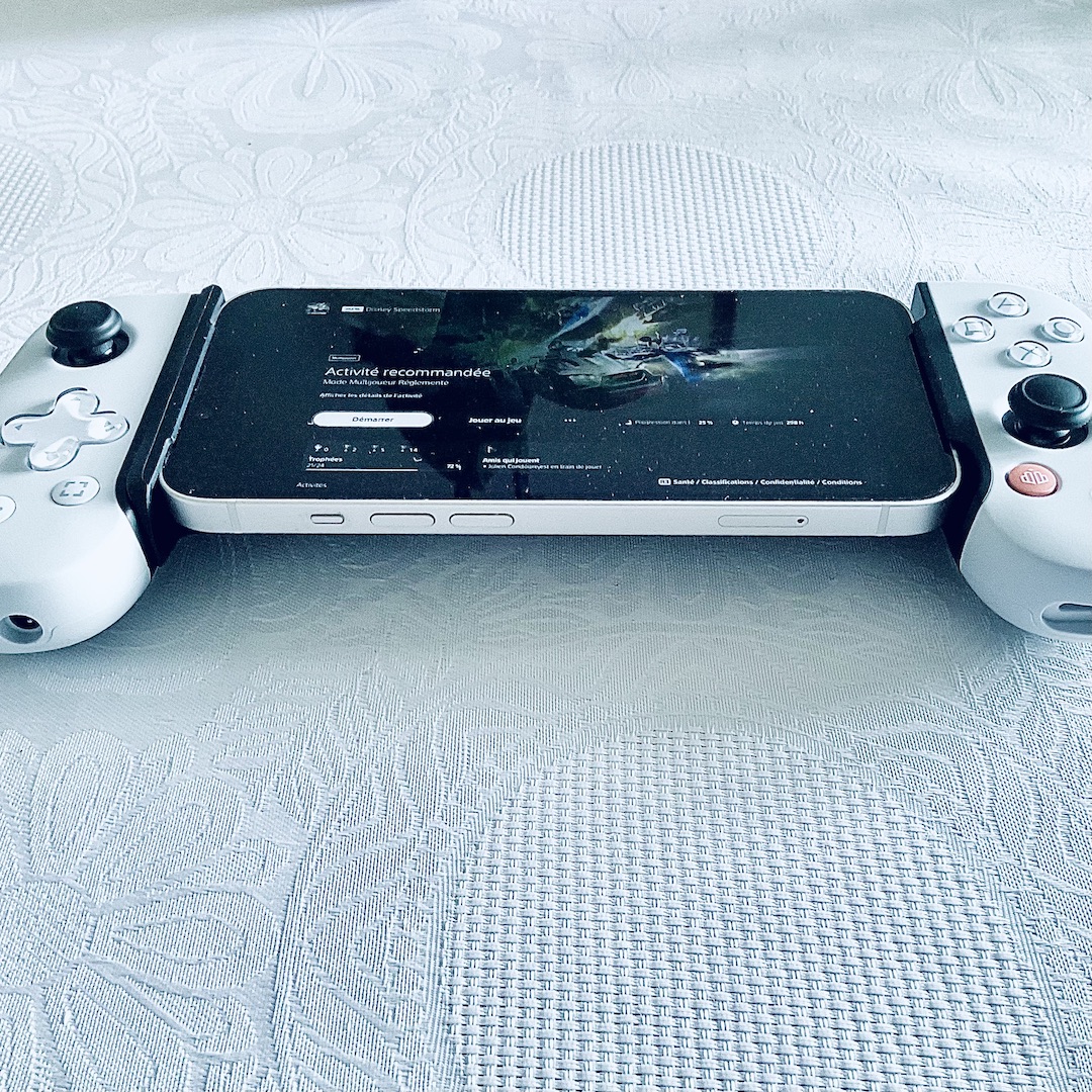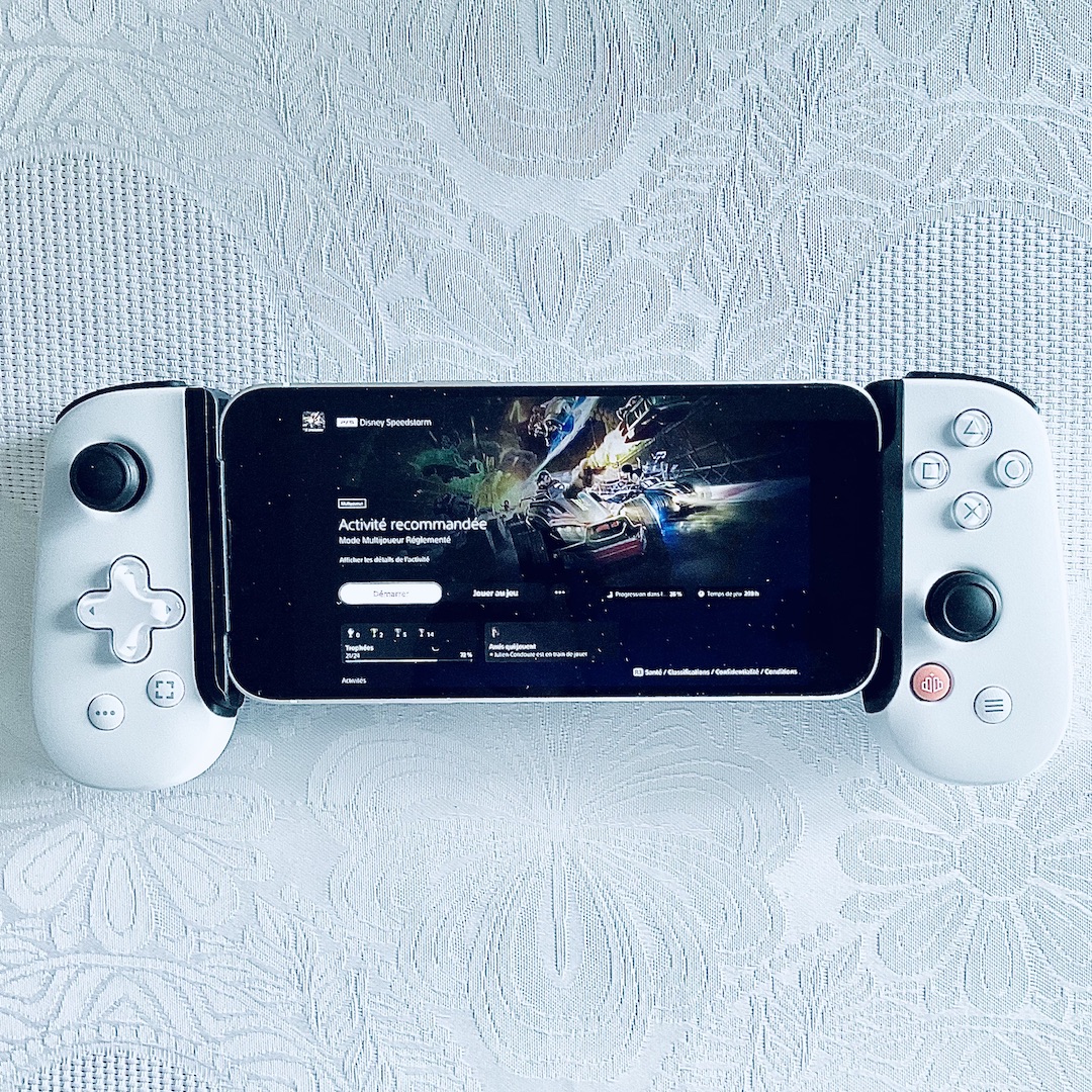 À ma première utilisation, j’installe l’application Backbone, je regarde les réglages et au moment de me lancer, je vois qu’il est nécessaire d’activer un abonnement pour jouer. Ce que je ne savais pas c’est que ce même abonnement n’est pas obligatoire !! Il vous suffit de télécharger l’application Remote Play (pour PlayStation) et de brancher votre téléphone à l’accessoire. J’ai donc pu tester le produit sur des jeux assez dynamiques comme par exemple le jeu de course : Disney Speedstorm. Et, malgré ma connexion foireuse, j’ai réussi à finir premier d’un tournoi. Alors oui, parfois ça ramait un peu, l’image n’était pas toujours très nette, mais encore une fois cela provient très certainement de ma connexion en carton. Je vous conseillerai donc, pour une utilisation optimale, d’avoir un Wifi solide ! Enfin, l’objet comporte toutes les touches et ports nécessaires (dont une prise casque 3,5 mm).