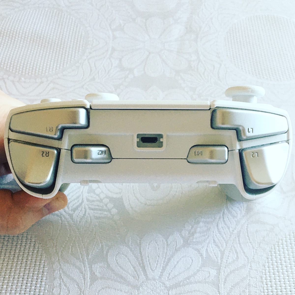 D’un point de vue boutons supplémentaires rien de neuf, si ce n’est les gâchettes arrières qui ressemblent plus à de gros boutons plats maintenant. Je trouvais ça un peu étrange au départ mais rien de bien dérangeant au final. Les boutons « méca-tactiles » sont très agréables, bien que moins réactifs vis-à-vis des précédents boutons « Hyperesponse » de la même marque. Il est toujours possible de raccourcir la course des gâchettes L2 et R2 pour répondre plus rapidement, notamment dans les jeux de tir. On remarque également la présence du bouton de réglage, entre la croix directionnelle et le joystick droit. Celui-ci permet de communiquer avec l’application sur votre smartphone.