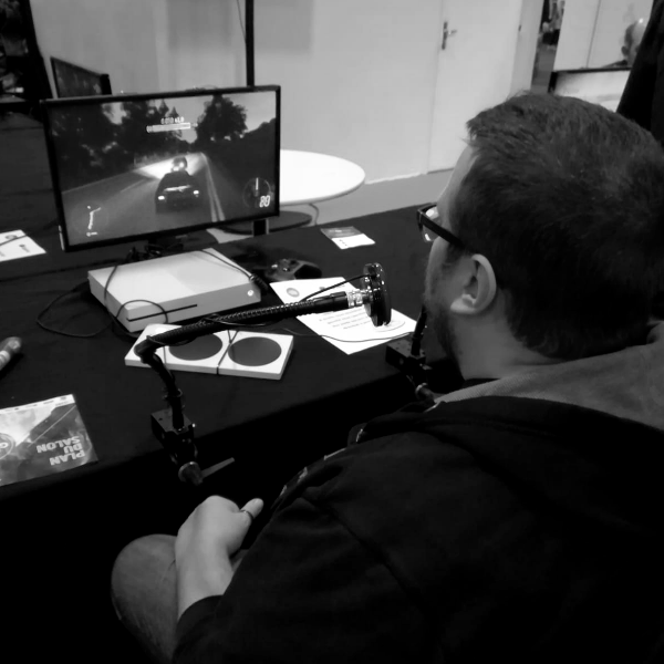 Leur présence à la PGW a attiré aussi bien les joueurs valides que ceux en situation de handicap, afin de sensibiliser tous les publics au sujet de l’accessibilité de ce loisir qui réunit les gamers de tout horizon. Sur le stand j’ai pu tester les commandes tête/pieds, ou plus précisément un jeu de voiture avec l’accélération et le frein à la tête et le volant aux pieds, sans utiliser les mains. Autant dire que ce n’était pas évident ! En appuyant sur un périphérique à gauche avec ma joue j’utilise le frein, alors qu’à ma droite j’utilise l’accélérateur. Et aux pieds, en inclinant à gauche ou à droite je tourne le volant. (Voir la photo plus bas)