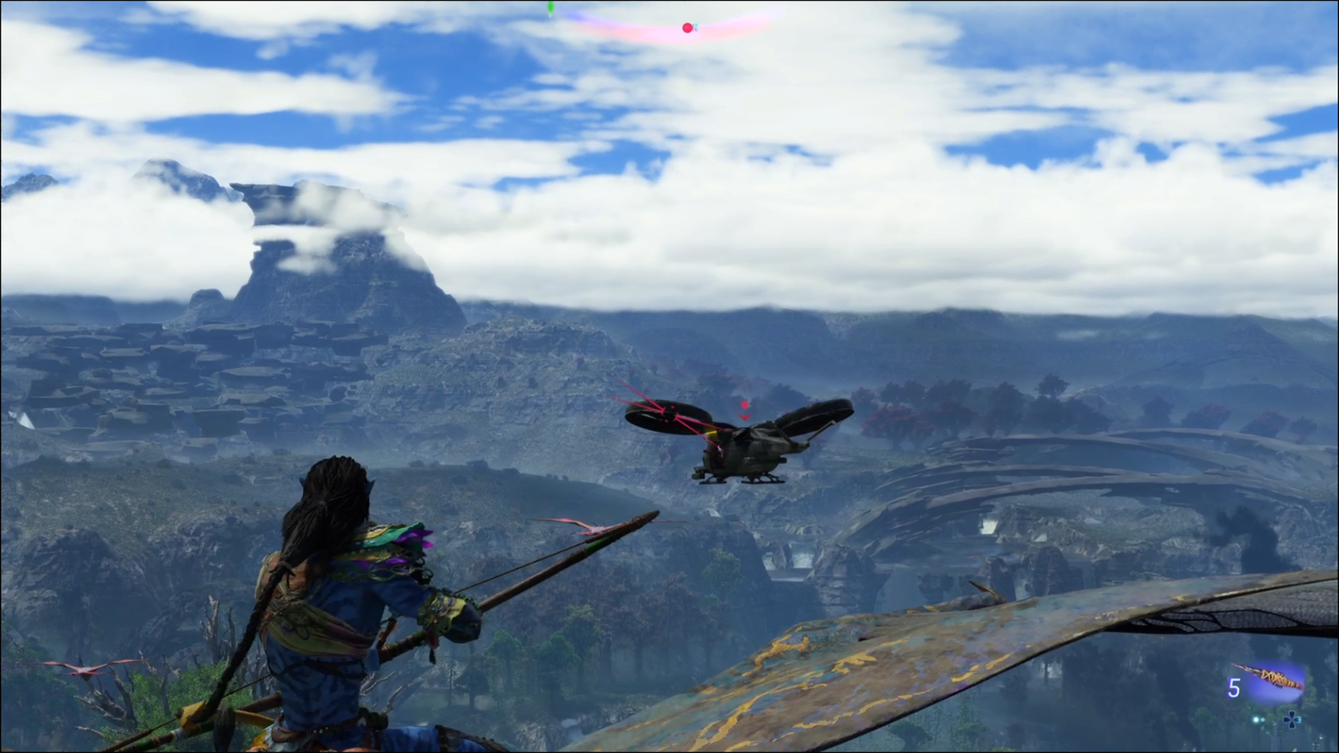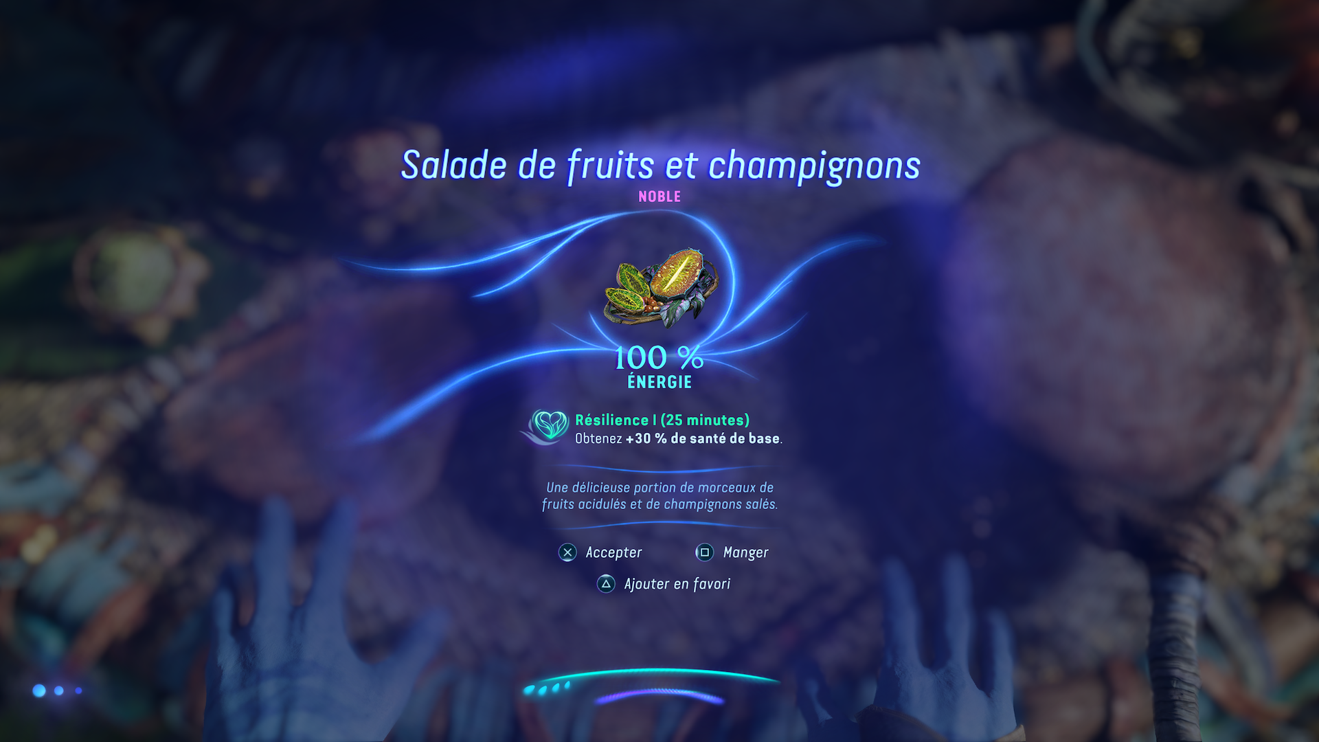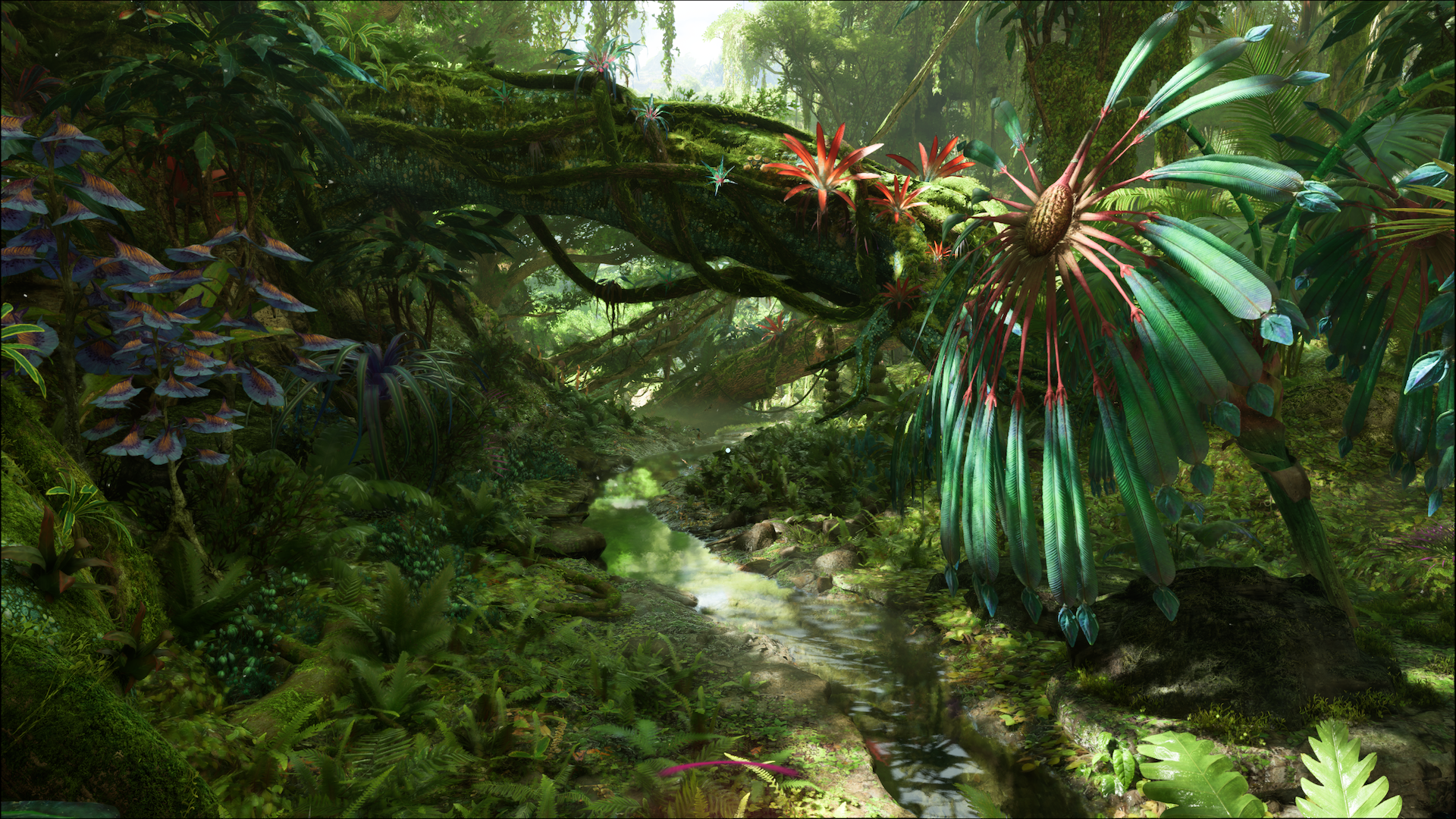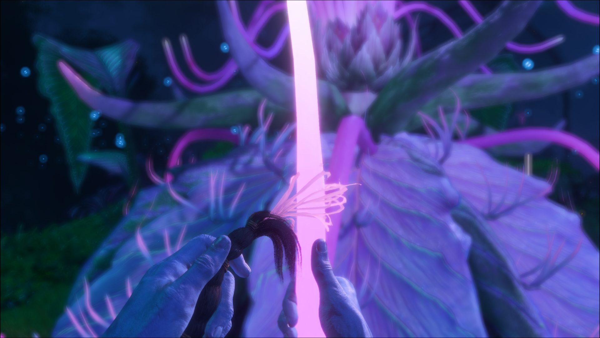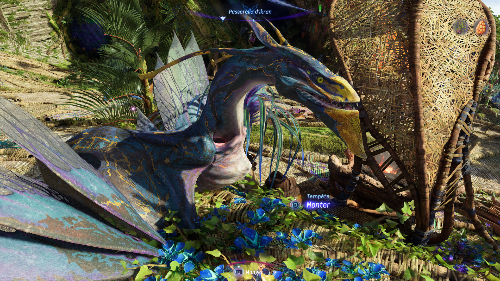 Parlons ensuite du Gameplay ! Comme dit plus haut, il s’agit d’un jeu de tir à la première personne. Vous devrez manier les armes Na’vi mais également humaines. Le titre est considéré, très certainement à tort, comme un Far Cry au skin Pandora de par ses mécaniques similaires. En effet, vous pourrez récolter des matériaux pour crafter des armes ou armures afin d’augmenter vos statistiques. Mais ce n’est pas tout, l’ensemble des mécaniques a été adapté aux uses et coutumes Na’vi. Il faudra respecter la faune et la flore si vous souhaiter obtenir de meilleures récoltes. Comprenez par là qu’il faudra cueillir votre nourriture selon la météo et le cycle jour/nuit. Car oui, j’ai oublié de le dire mais il sera important de cuisiner et de manger. Quant à la chasse, il faudra respectez vos proies, viser juste et ne pas tuer au hasard. Un peu comme quand Neytiri apprend à Jake comment chasser. Vous pourrez également débloquer via des arbres de compétences de nouvelles aptitudes pour vous et votre Ikran (ou Banshee).
