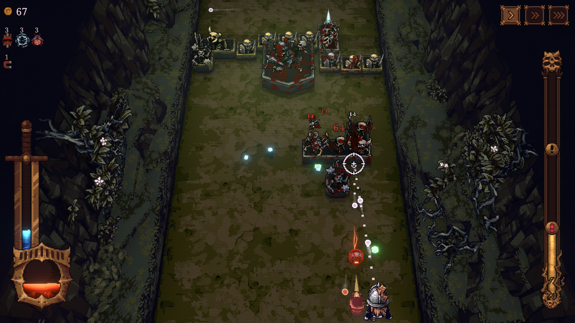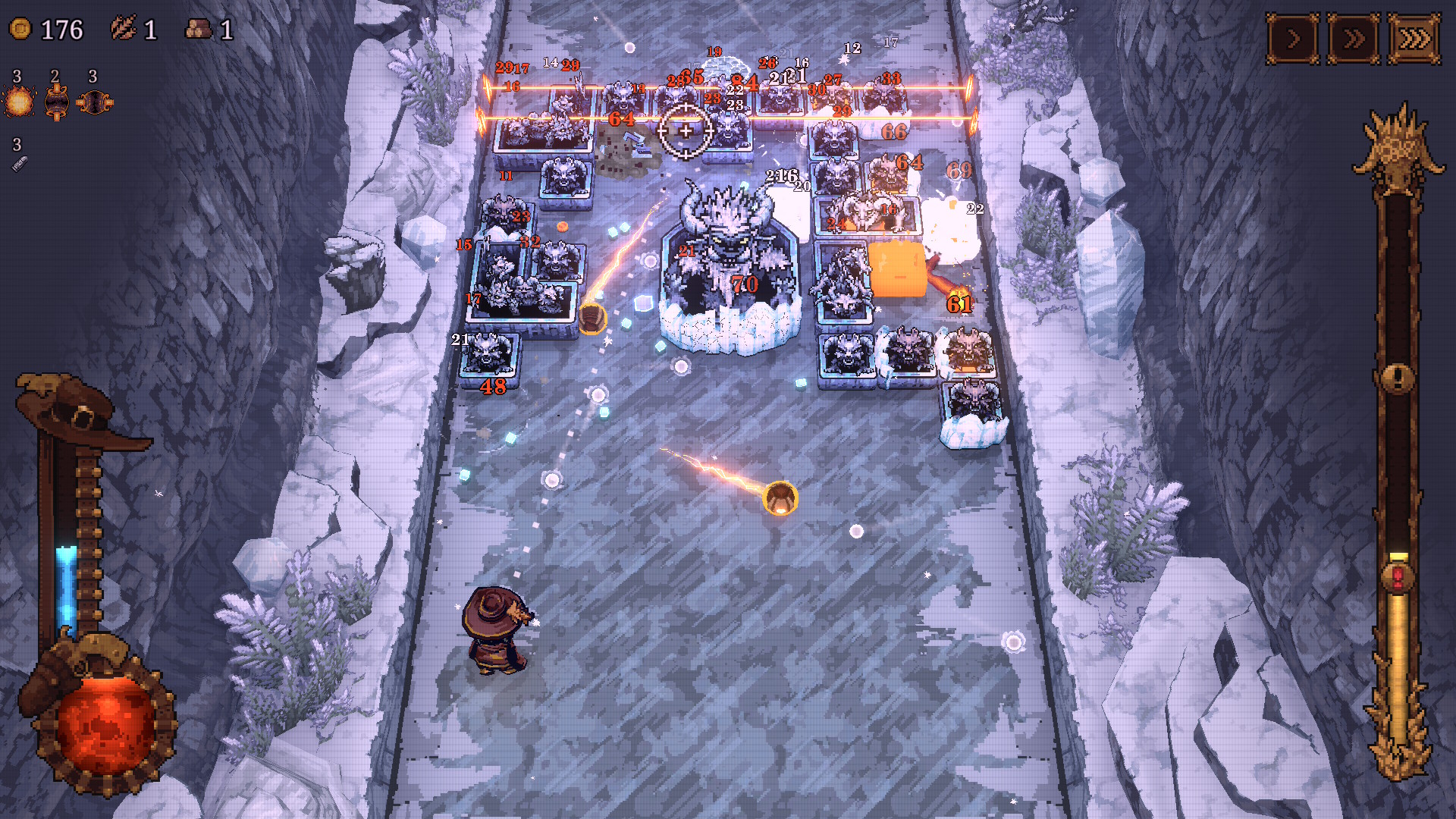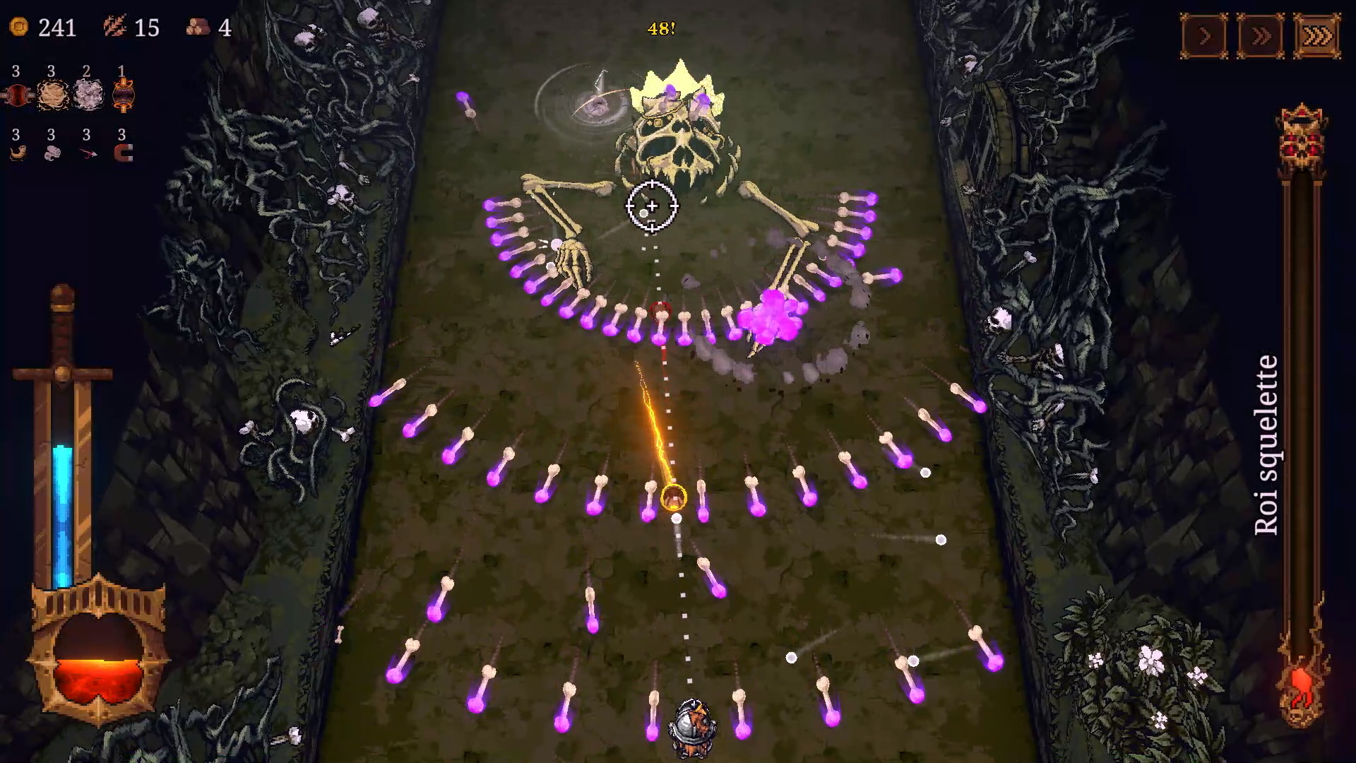 Ce jeu est un mix des genres ! Mélange entre un casse-briques, un Space Invaders et un Vampire Survivors, c’est absolument addictif, vous ne pouvez pas vous imaginer ! La prise en mains est immédiate, c’est à la fois fun et challengeant. Le côté Die & Retry ici n’est pas aussi frustrant qu’il peut l’être sur d’autres softs. À chaque victoire ou défaite vous empocherez des matériaux pour développer votre village et ainsi améliorez vos statistiques et débloquer de nouveaux personnages. Alors certes cette partie gestion ne plaira pas à tout le monde mais cela ajoute de la profondeur au titre. D’autant plus que le jeu souffre d’une certaine répétitivité dans la structure de ses niveaux…