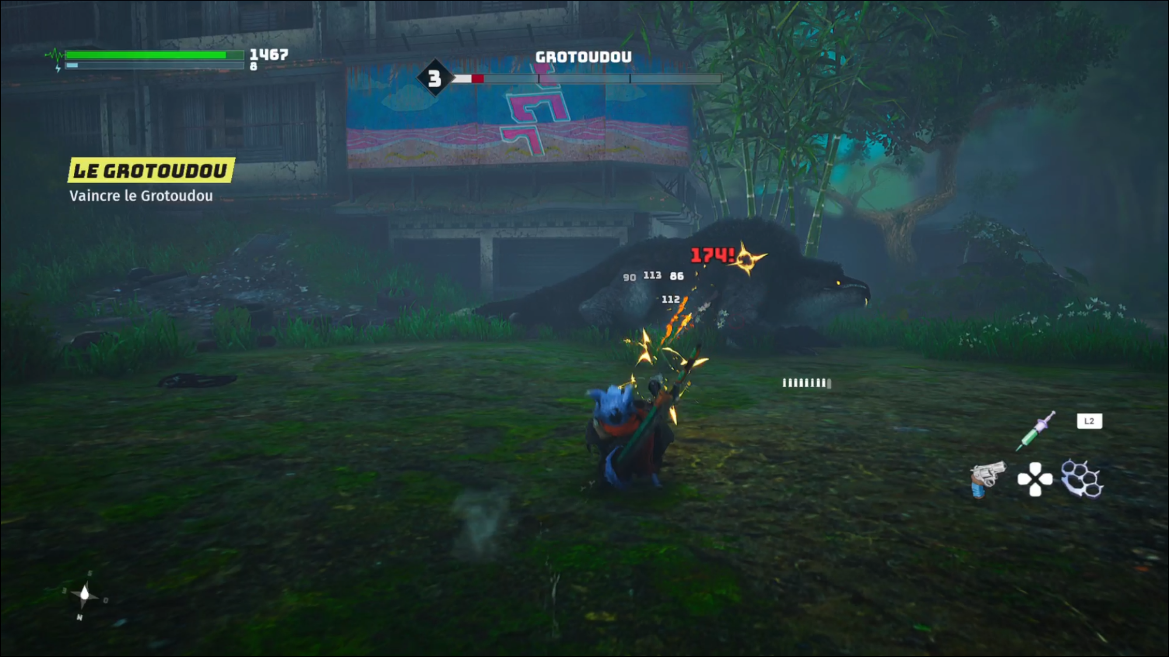 Ce RPG est un savant mélange de plusieurs styles de jeu, à la fois complet et plaisant vous aurez de quoi faire. Sa vaste map post-apocalyptique, composée de divers biomes est remplie de nombreuses quêtes annexes. Mais qui dit immense open-world dit forcément du recyclage, et dans Biomutant je n’ai pas cessé d’en croiser malheureusement… Que ce soit dans les différentes habitations, les dialogues etc. Pour combattre vous aurez bien évidemment le Wung-fu, mais également des armes au corps à corps et autres armes à distances. Cet arsenal peut être acheté, trouvé ou même fabriqué de vos mains. Pour cela, il vous faudra donc récupérer du butin un peu partout, aux quatre coins du monde. Les affrontements sont plutôt stylés, mais la caméra parfois capricieuse, ou le manque de punch, pourront déplaire à certains, là aussi.