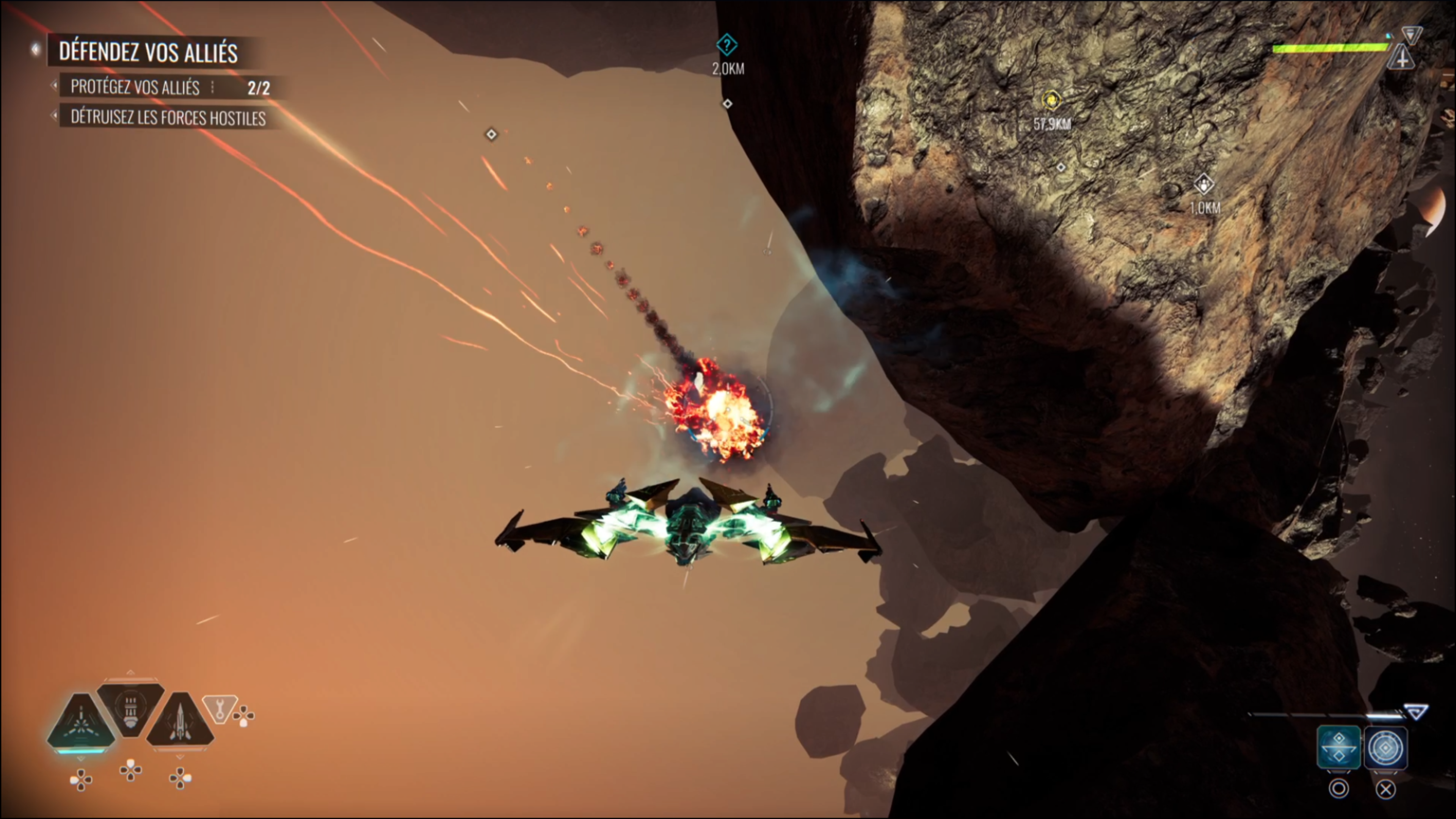 D’un point de vue gameplay, le pilotage dans ce monde semi-ouvert (plusieurs vastes zones) se fait sans accros et les phases de shoot sont grisantes. Ce qui va venir compliquer les choses dans un premier temps, ce sont les Rites. Faciles à utiliser certes, mais l’ensembles des manœuvres requises pour éliminer les différents assaillants, demandent un certain doigté. La prise en main est donc difficile à maîtriser (mais pas impossible) surtout quand, comme moi vous avez un handicap à une main. Heureusement, il est possible de remap les touches, et ça c’est une bonne nouvelle, croyez-moi ! Dans un second temps, ce qui est assez frustrant, c’est que le jeu considère un peu trop vite que la mission est un échec si vous ne remplissez pas les conditions demandées. Un ennemi vous sème ? Échec. Un des alliés que vous devez protéger perd trop de vie ? Échec. Et d’autres petites fonctionnalités sont selon moi mal pensées. Comme par exemple quand vous vous approché trop près d’un point d’intérêt, la mission se lance automatiquement.