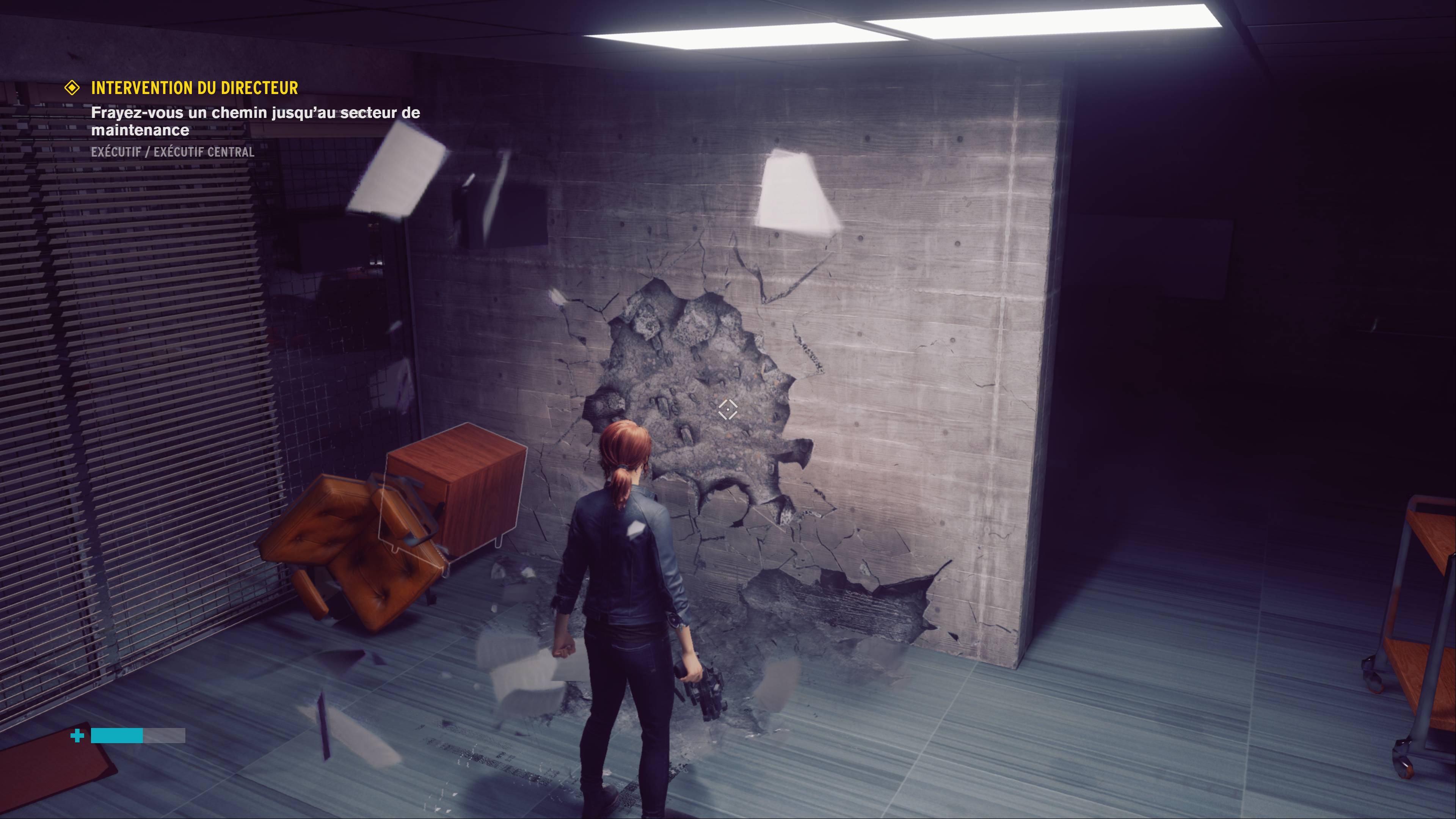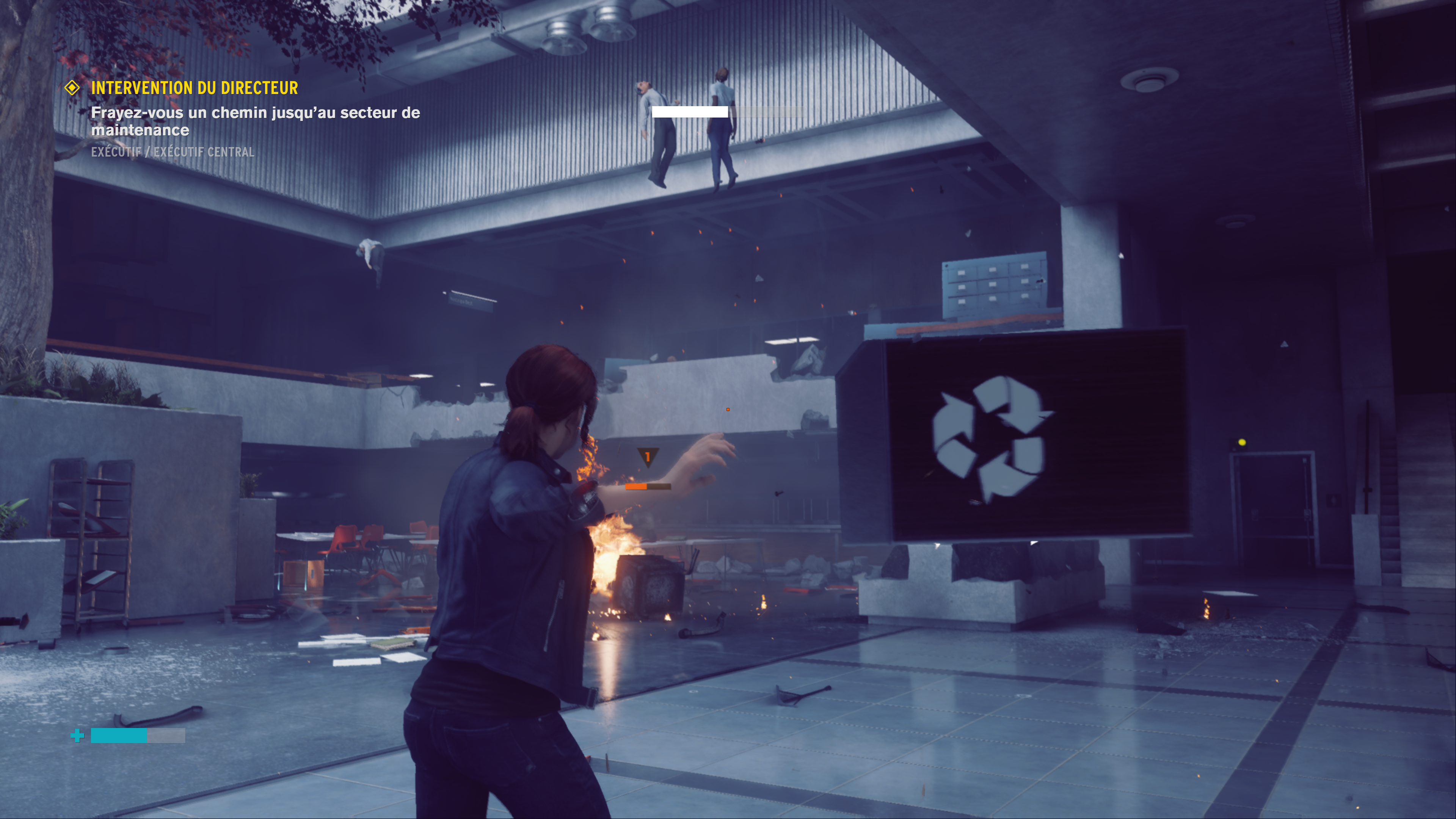 Vous devrez donc affronter des gardes armés jusqu’aux dents, dans des combats nerveux, à l’aide d’armes et de pouvoirs psychiques (télékinésie,…) puissants, voir jouissifs !! La prise en mains se veut exemplaire et accessible à tous, ce qui est un excellent point. L’exploration du Bureau, bien que labyrinthique à certains moments, reste plaisant à parcourir. L’aventure est toute fois quelque peu linéaire mais nous plonge dans une histoire intrigante, en essayant de repousser les limites de notre perception des choses. La narration ayant une place importante, elle nous guidera tout du long… Alors certes je trouve, pour je-ne-sais-quelle-raison, un manque d’empathie envers le personnage de Jesse. Est-ce à cause du chara-design ? De ses expressions faciales ? Ou de la VF ? Quoi qu’il en soit je vous conseille de faire le soft en VOSTFR.