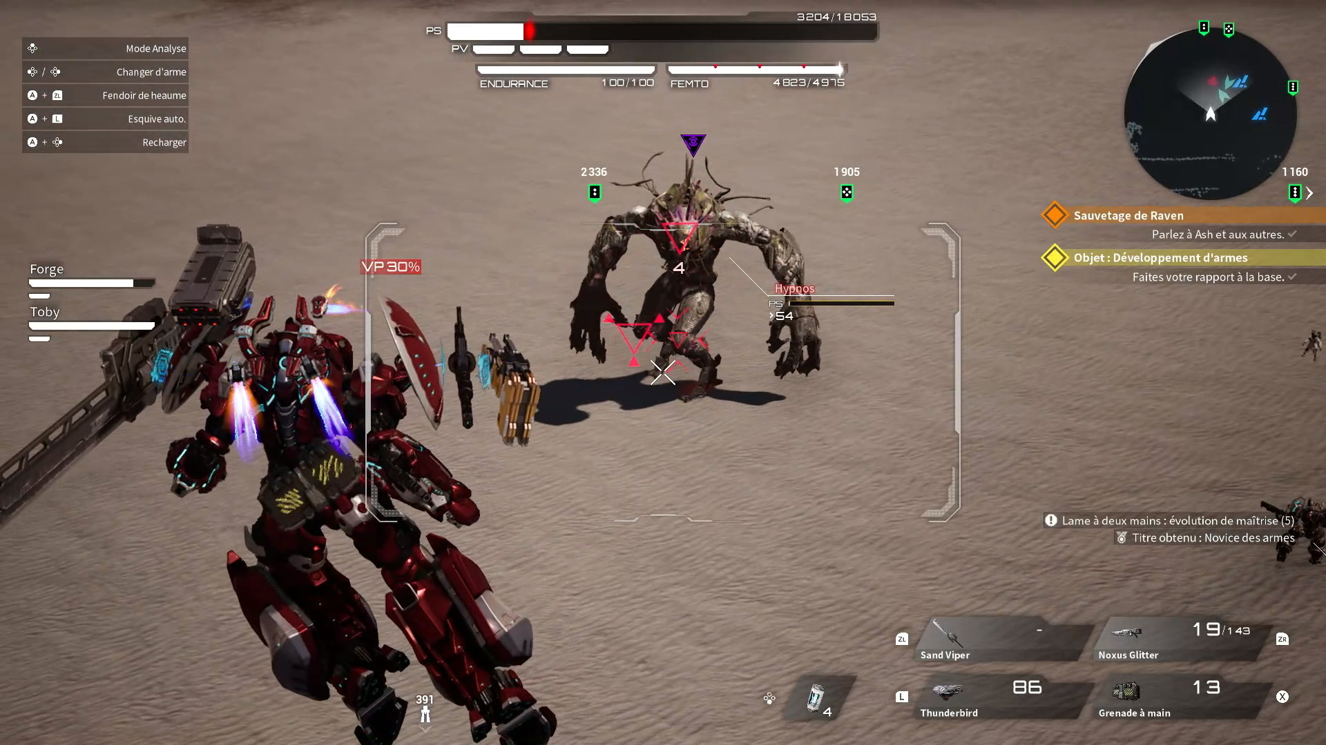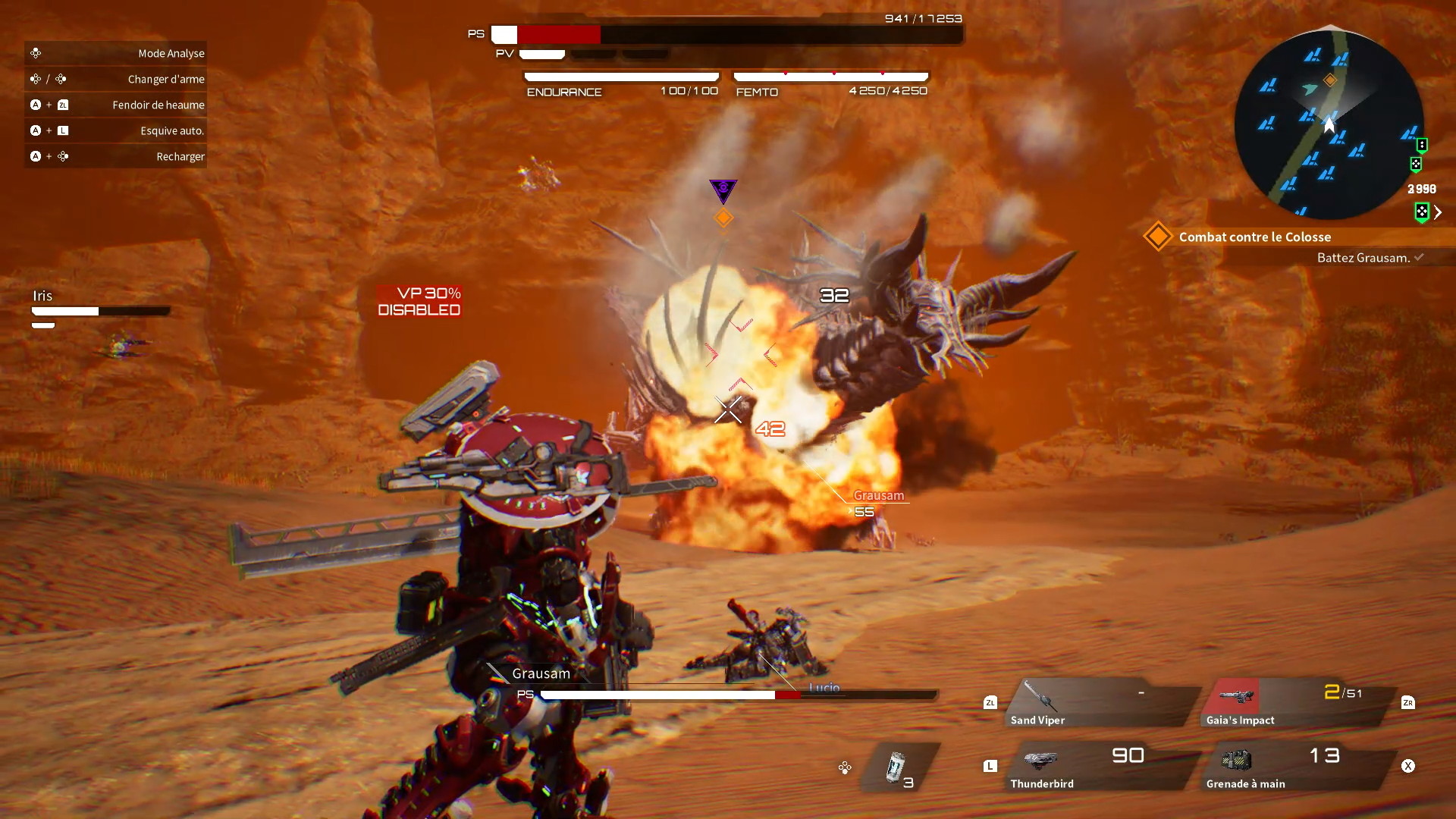 Tout d’abord, pour être honnête et ne pas descendre le soft gratuitement, je vais vous parler de ses qualités. Le titre de Marvelous à été pensé pour les fans de Mechas comme moi ! Le build est ultra-complet !! Vous pourrez construire votre propre armure de A à Z, de la tête au pieds en passant par les 4 slots d’armes, plus l’arme à l’épaule et l’auxiliaire. Chaque carcasse d’ennemi laissera dernière lui des éléments que vous pourrez récupérer. Et ce n’est pas tout ! Vous pourrez également modifier la « nature » de votre pilote en lui octroyant des caractéristiques de monstres vaincus. Cela changera en plus votre apparence humaine… J’adore ! Le gameplay lui aussi est nerveux et efficace. De ce côté là, je n’ai rien à dire. Sans oublier une mention spéciale pour certains combats de boss et le Colisée.