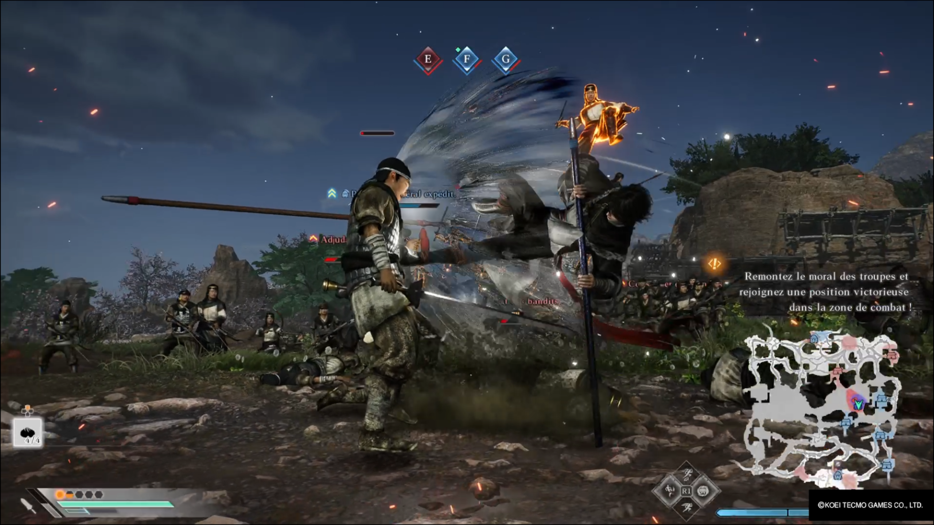 Dans un pays divisé en trois Royaumes et ravagé par les guerres, vous incarnez un mercenaire inconnu et amnésique qui fera tout son possible pour instaurer la paix. Sans trop spoiler, vous en apprendrez plus sur vous, sur cette période, à travers une histoire intéressante et qui se laisse suivre facilement. Les Dynasty Warriors sont des Musô où vous devrez menez des batailles contre de multiples ennemis. Les combats en 1 contre 100 sont toujours ultra jouissifs grâce notamment à un gameplay bien rôdé et surtout très nerveux. Dommage qu’il y ait un manque de lisibilité, à cause du nombre conséquent d’assaillants certes, mais aussi à cause de la caméra.