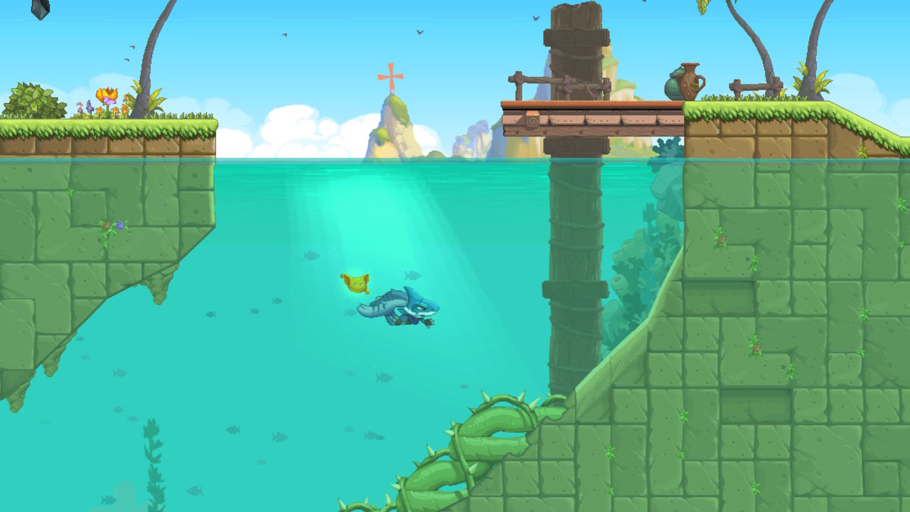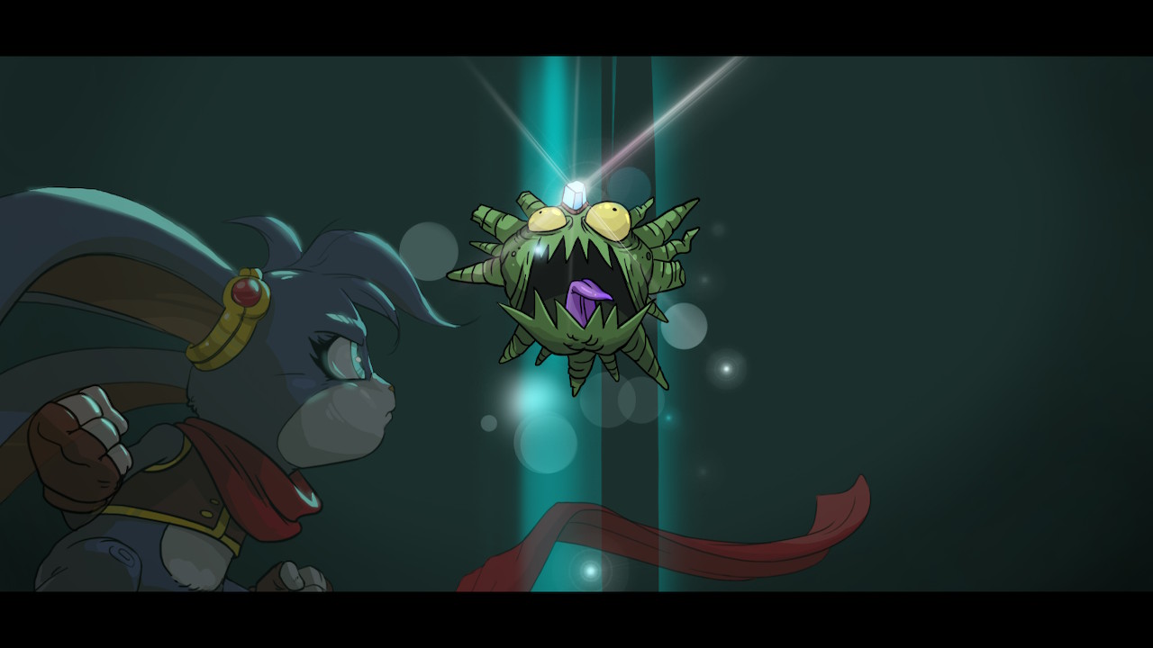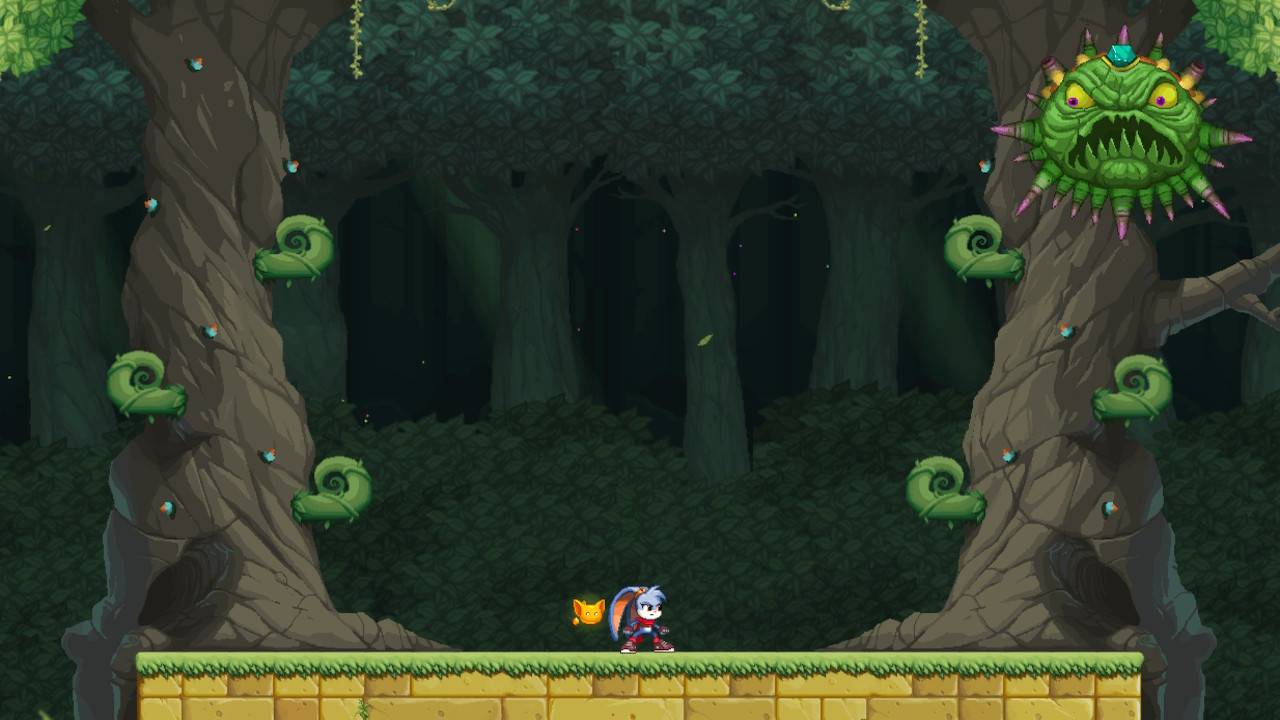 Tout d’abord, je me dois de souligner le magnifique travail effectué autour des graphismes en pixel art. Le tout s’avère être vraiment maîtrisé, avec de très jolis décors. Je suis un poil moins convaincu par certaines créatures du bestiaire, mais ça ce n’est que subjectif. D’un point de vue gameplay, le titre propose beaucoup de variété dans les différents niveaux, ce qui est vraiment plaisant. Notre personnage peut sauter, taper, s’agripper à des lianes ou planer à l’aide de ses oreilles. Grâce notamment aux masques nous pourront aussi voler, nager, etc. Malheureusement, j’ai pour ma part un sentiment de déjà-vu, car le soft reste tout de même très classique. J’ai apprécié retrouver les sensations un peu old-school des anciens plateformers mais j’aurais bien aimé être un peu plus surpris…