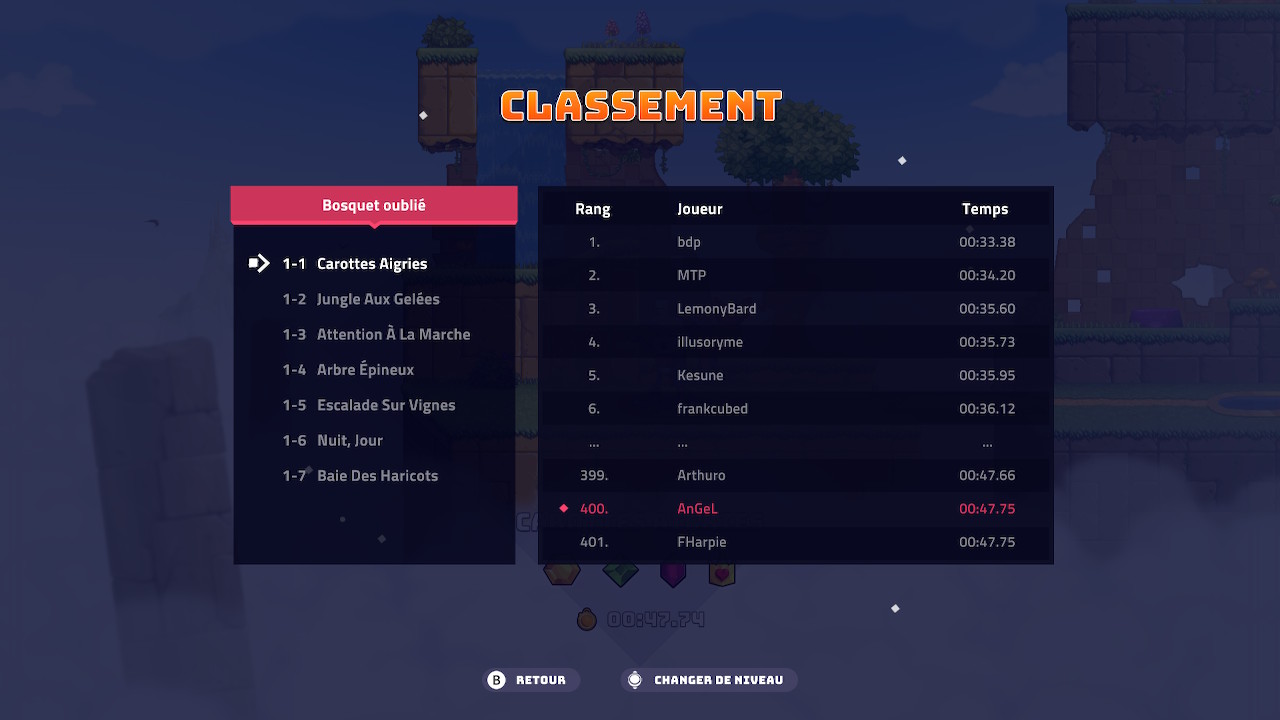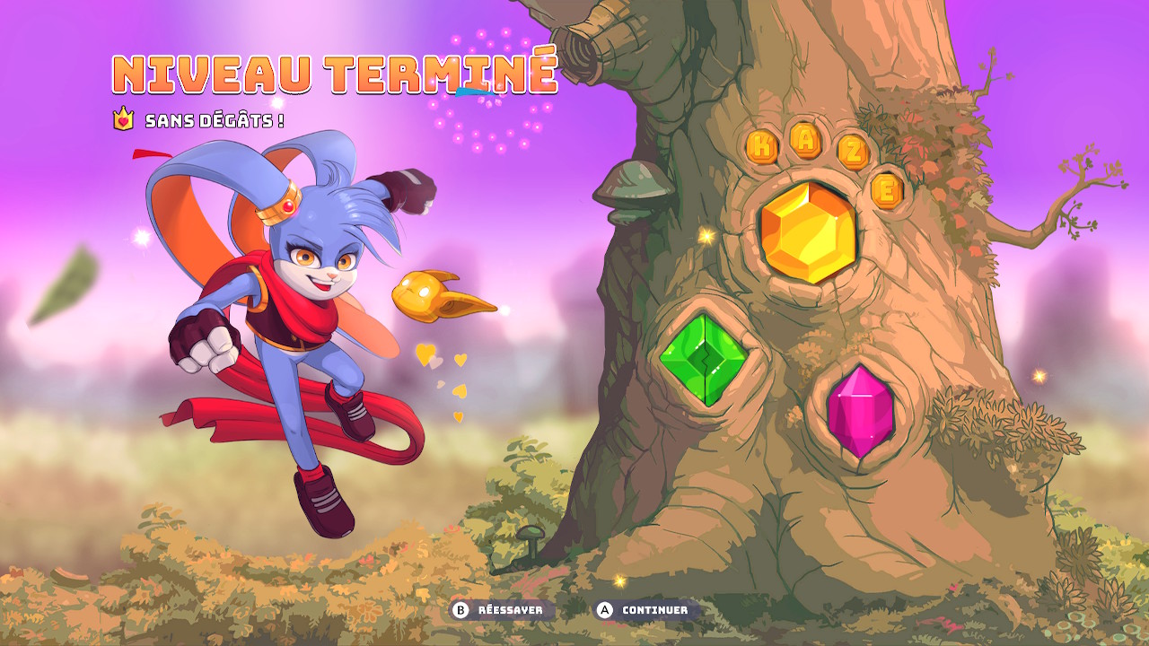 Kaze reste un titre assez complet, surtout si vous souhaitez le finir à 100%. Vous pourrez même refaire les niveaux en mode contre-la-montre et ainsi surveiller votre classement mondial. Après, je ne sais pas si cela vient de mes joysticks Switch, mais j’ai trouvé la gestion des mouvements légèrement approximative… Déjà que le jeu est assez frustrant à de nombreux moments, j’ai ragé plus d’une fois. Ou alors, c’est que je me fais vieux tout simplement ! Enfin, j’ai apprécié les combats de boss qui terminent les différents mondes. Voilà, sachez que le jeu est disponible pour une trentaine d’euros, donc si vous aussi vous êtes à la recherche d’un jeu de plate-forme à l’ancienne : Foncez !