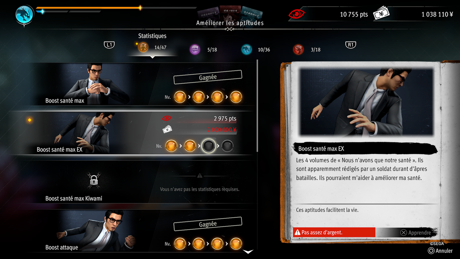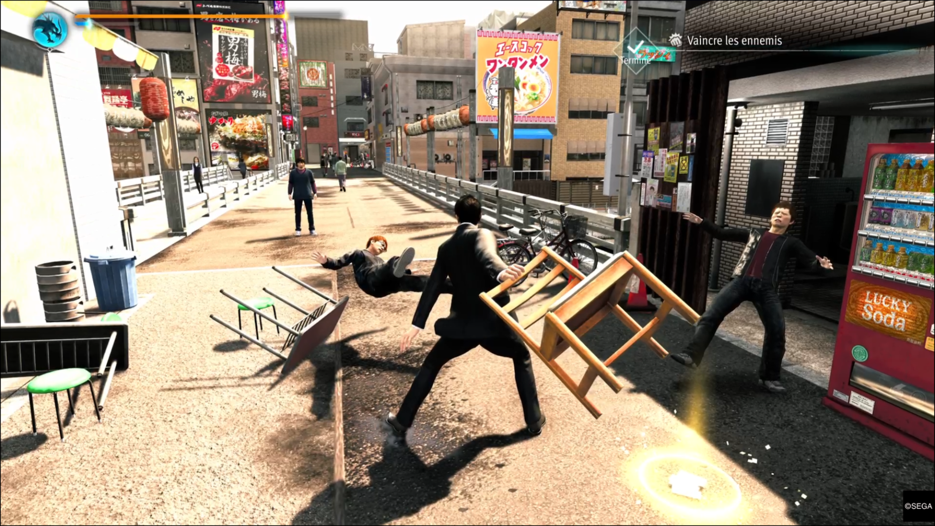 D’un point de vue scénario, même si ce dernier n’est pas aussi développé qu’à l’accoutumée, j’ai trouvé les enjeux assez intéressants. Vous y rencontrerez des têtes connues, des personnages charismatiques. Vous aurez beaucoup à faire à Sotenbori : Entre les nombreuses mission Fedex du réseau Akame, les mini-jeux (Fléchettes, billard, Karaoké et j’en passe) et l’histoire principale… La durée de vie s’annonce assez conséquente, pour ceux qui ne s’en tiendront pas qu’à l’intrigue principale. De plus c’est toujours un bonheur de se balader dans les rues japonaises, le dépaysement est total ! J’ai également apprécié le Colisée et ses multiples épreuves. De quoi renflouer les caisses, car l’argent servira notamment à améliorer et débloquer vos compétences. Au final, et même si je trouve le soft assez bavard encore, j’ai pris un malin plaisir à développer mon personnage et à défoncer du méchant. Un excellent titre que je vous conseille surtout si vous aimez la série des Like a Dragon. Enfin, sachez que la démo du prochain « Infinite Wealth » sera disponible gratuitement avec le jeu.
