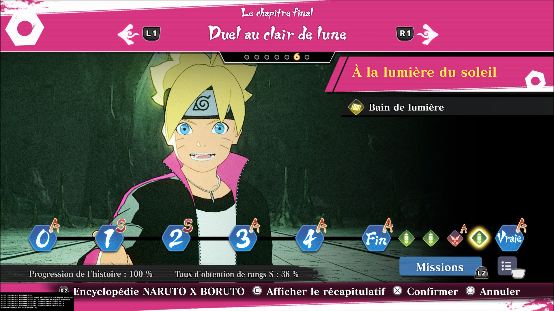 Tout d’abord, il faut s’avoir que le jeu propose un contenu Dantesque ! Entre les +130 personnages disponibles, les 66 arènes, et les bonus à débloquer (Costumes, couleurs alternatives etc.) vous pourrez profiter un maximum de votre soft. Dommage qu’il existe encore des DLC payants… Selon moi tout aurait du être sur le disque, comme les musiques officielles de l’anime par exemple. Le jeu propose tout de même la VF officielle, ce qui reste une bonne nouvelle pour tous les fans Français. Il y a également deux modes « histoire » , l’un retraçant de A à Z l’épopée de Naruto et l’autre proposant un scénario inédit autour de l’univers de Boruto. Alors même si on aurait préféré l’histoire officielle de Boruto, ce scénario inédit s’en sort pas trop mal ! Ce qui choque un peu c’est la mise en scène plutôt vieillotte en images et non en cinématiques. De quoi se dire que le minimum à été fait sur cette compile !