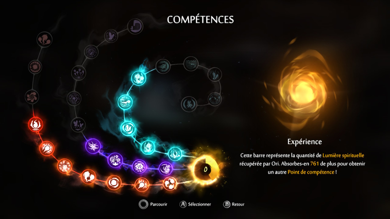 Par où commencer ? Tout d’abord ce qui marquera les esprits sera la sublime direction artistique !! Que ce soit les magnifiques graphismes, la musique enchanteresse, les effets de lumières… Tout un ensemble pour le moins séduisant, qui cherche aussi bien dans le côté apaisant, chatoyant d’une forêt accueillante, au côté sombre et terrifiant d’un bois mystérieux. L’ensemble s’adaptant parfaitement au gameplay maîtrisé, simple et efficace, et à la prise en main exemplaire. Les commandes répondent au doigt et à l’œil, et s’étoffent tout au long de l’aventure, au fur et à mesure de votre progression. Eliminer des ennemis rapportera de l’expérience et donc des points de compétences afin d’acquérir plus d’aptitudes.