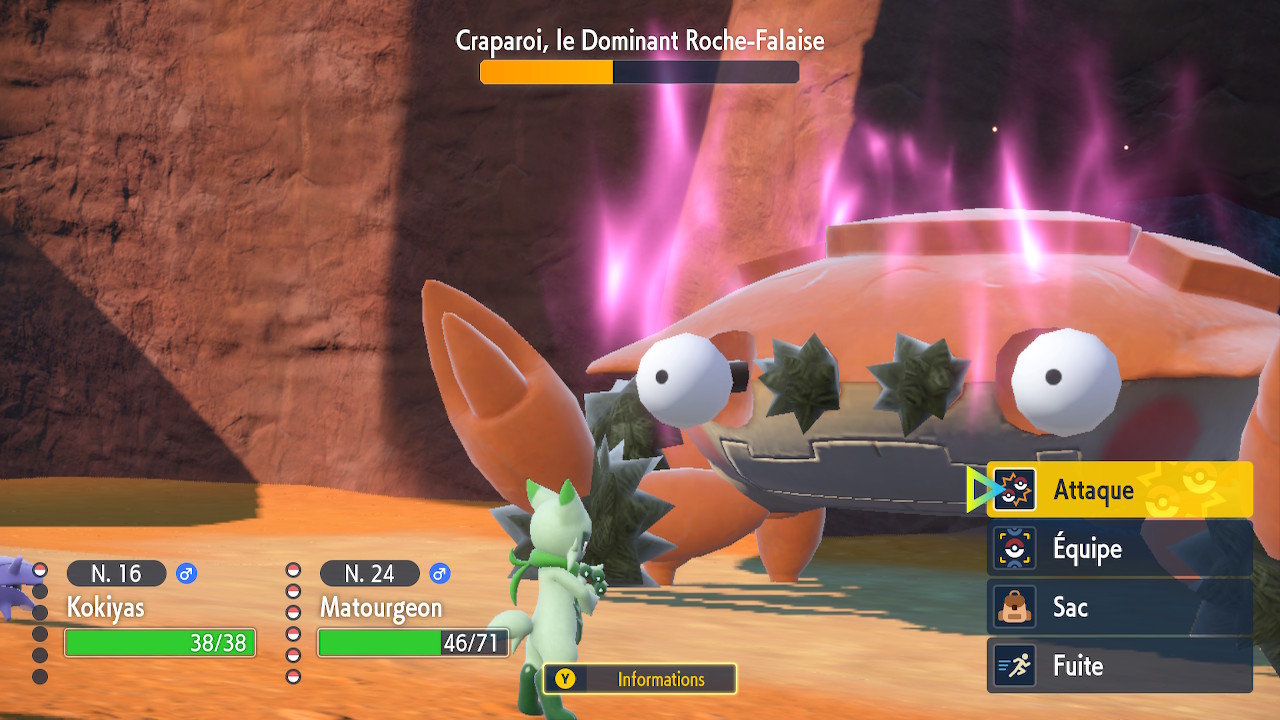 Seulement voilà, on ne va pas se le cacher plus longtemps, techniquement parlant c’est catastrophique ! Graphiquement daté d’une époque lointaine, c’est juste abusé. Les décors sont vides, des bugs en tous genres surgissent un peu partout, du clipping et de l’aliasing se sont invités à la fête… Bref, c’est assez habituel avec cette licence, les développeurs se reposent sur leurs lauriers, mais là, ça en devient gênant. Heureusement, la Direction Artistique, des Pokémons et des menus épurés, sauve un peu les meubles. À noté que de bonnes nouvelles idées, comme la téracristalisation, sont les bienvenues. Au final, et malgré la partie technique désastreuse, ce n’est pas un mauvais jeu. J’y ai même passé du bon temps. Je regrette tout de même ce pas en arrière d’un point de vue gameplay, qui forcément baissera ma hype.