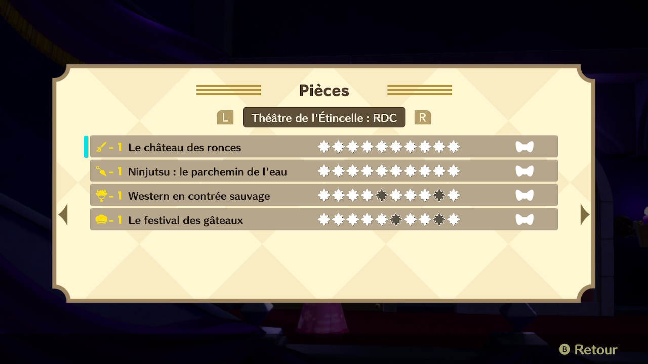 Ce Princess Peach est en quelque sorte une succession de mini-jeux, le tout étant compartimenté par tableaux… Comme différentes pièces de théâtre, en soit l’univers est assez bien réussi. Il y a des passages intéressants, je l’admets, mais pas forcément innovants. C’est à la fois varié et accessible !! Mais dans l’ensemble j’ai trouvé le soft assez plat, comme si nintendo récitait ses leçons de gameplay apprises par cœur. Dommage donc, car cela reste agréable à parcourir, mais le manque de challenge se fait ressentir très rapidement. Sauf peut-être pour le 100% que j’ai tenté mais qui m’a vite lassé. Comptez 25 heures grand max pour ce dernier…