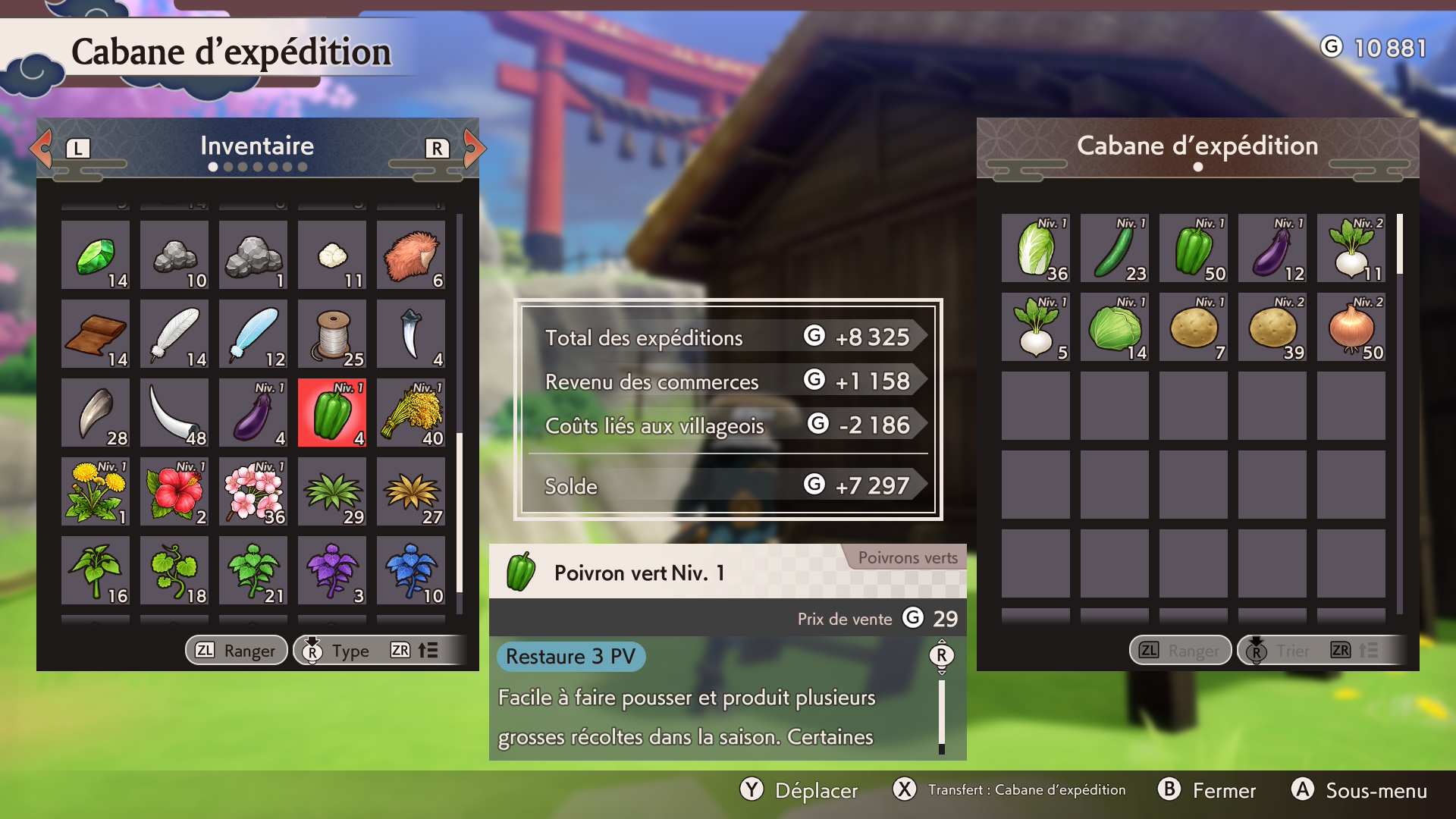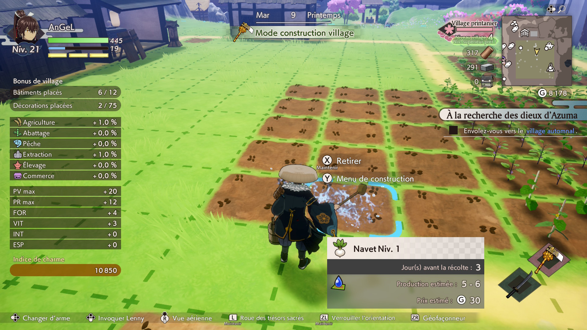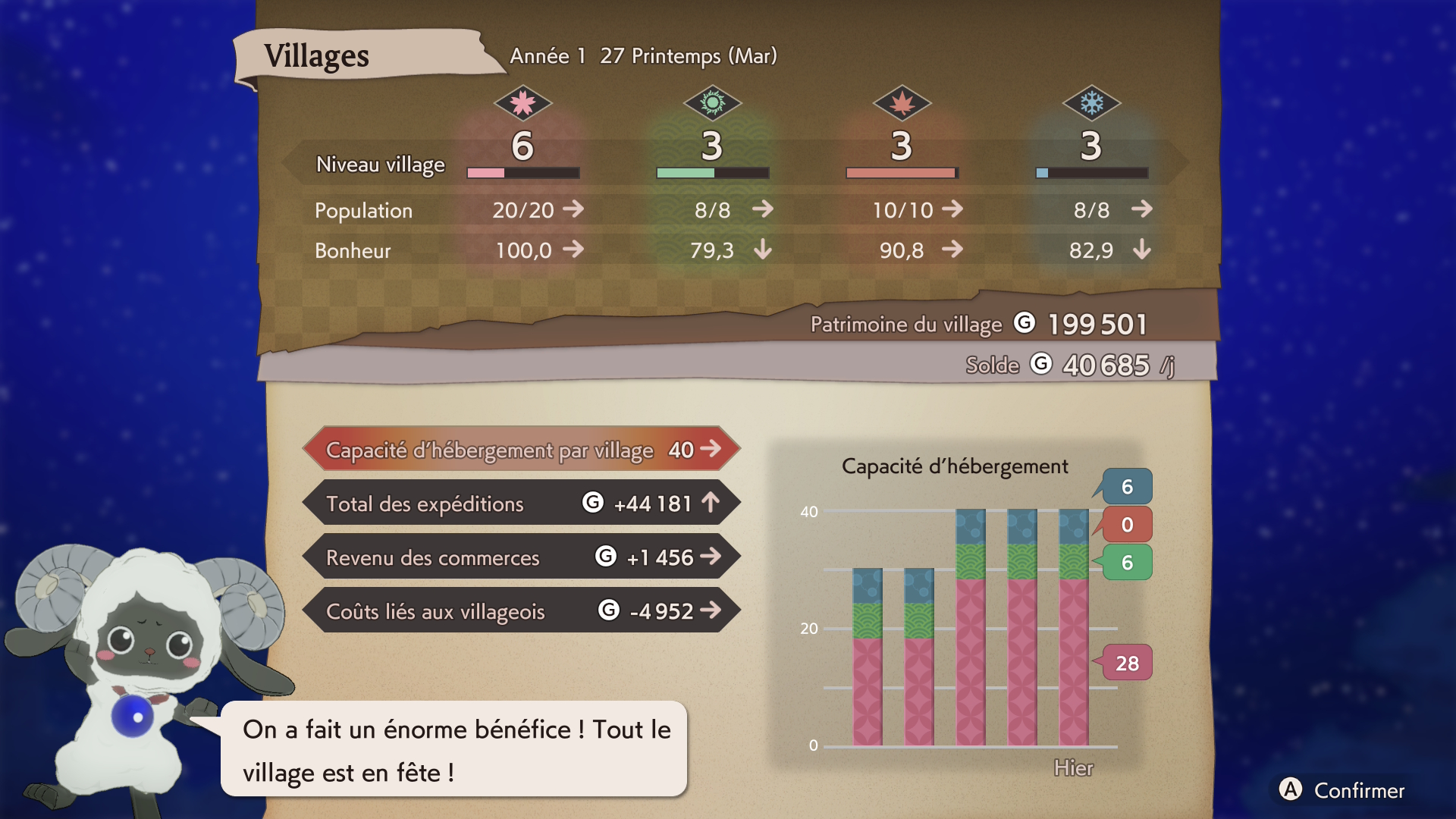 Vous commencerez la partie en choisissant un gardien ou une gardienne, puis après la scène d’introduction, vous vous réveillerez dans le village printanier. Vous l’aurez compris votre tâche sera de remettre le village en état. Et pour cela, il vous faudra entre autre, pour ne rien vous spoiler, gérer ce dernier en tant que chef ! À vous la gestion des plantations, et des récoltes que vous devrez vendre pour obtenir un capital, afin d’acheter armes et autres bâtisses pour vous et vos amis, ainsi que pour l’aménagement des lieux. Encore une fois, ça à l’air compliqué comme ça, mais c’est vraiment très accessible et ultra satisfaisant !!