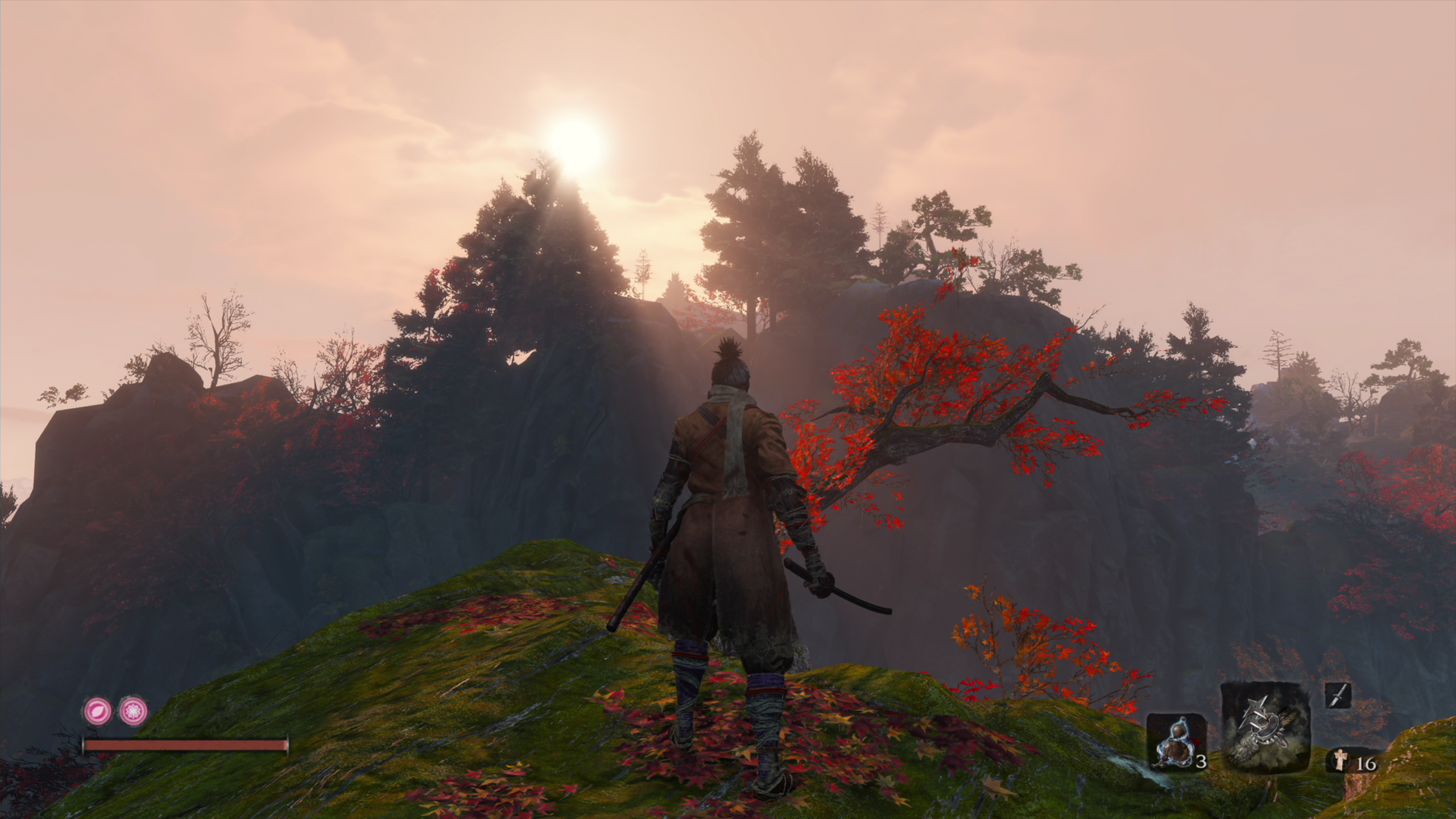 Ce qui marque avant tout dans Sekiro, hormis la difficulté, c’est sa capacité à nous faire voyager dans un Japon féodal, avec son ambiance particulière très bien retranscrite, de part ses environnements sublimes mais également sa bande-son enivrante ! Aux commandes de Loup, partez affronter des soldats et autres créatures d’un bestiaire varié, armé de votre katana mais aussi d’une prothèse au bras, qui aura de multiples fonctions. Le grappin par exemple, vous permettra de vous agripper à de nombreux points d’encrage, tandis que la hache sera efficace face aux boucliers, etc. Je regrette, cela dit en passant, que l’on ne puisse pas s’agripper partout, mais uniquement là où le jeu nous l’indique.