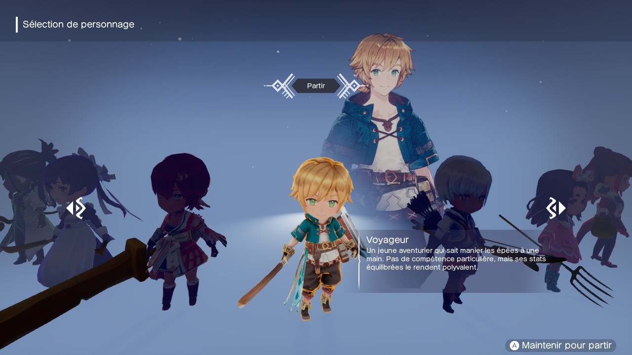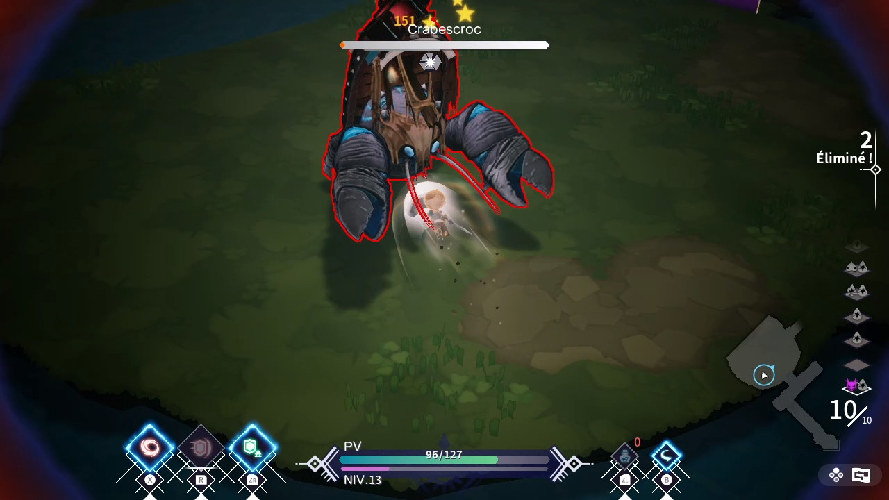 Choisissez donc votre protagoniste parmi les 7 disponibles. Personnellement j’ai choisi le Voyageur qui se bat avec bouclier et épée… Mais il existe 6 autres classes bien différentes, alors ne vous inquiétez pas, il y en aura pour tous les goûts. Et vous pourrez même switcher afin de tous les essayer, voir, de tous les améliorer. Chaque Héros possède ces armes et capacités distinctes qui correspondent à une façon de jouer (Corps-à-corps, Distance, Magie, etc…) et je dois avouer que, malgré ma préférences pour les personnages bourrins, j’ai développé entre autres l’Archer pour m’aider. À savoir que, les larmes de la princesses disséminées qui servent à terminer une session, permettent également le switch, mais qu’une fois face aux boss, il vous sera impossible de changer de classe. Vous y récolterez des ressources afin de fabriquer de nouvelles armes, l’XP vous permettra de débloquer de nouvelles capacités… et bien plus !! Le gameplay est donc bien rôdé, assez simple et surtout facile à prendre en main, d’autant plus qu’il est possible de re-mapper les touches !