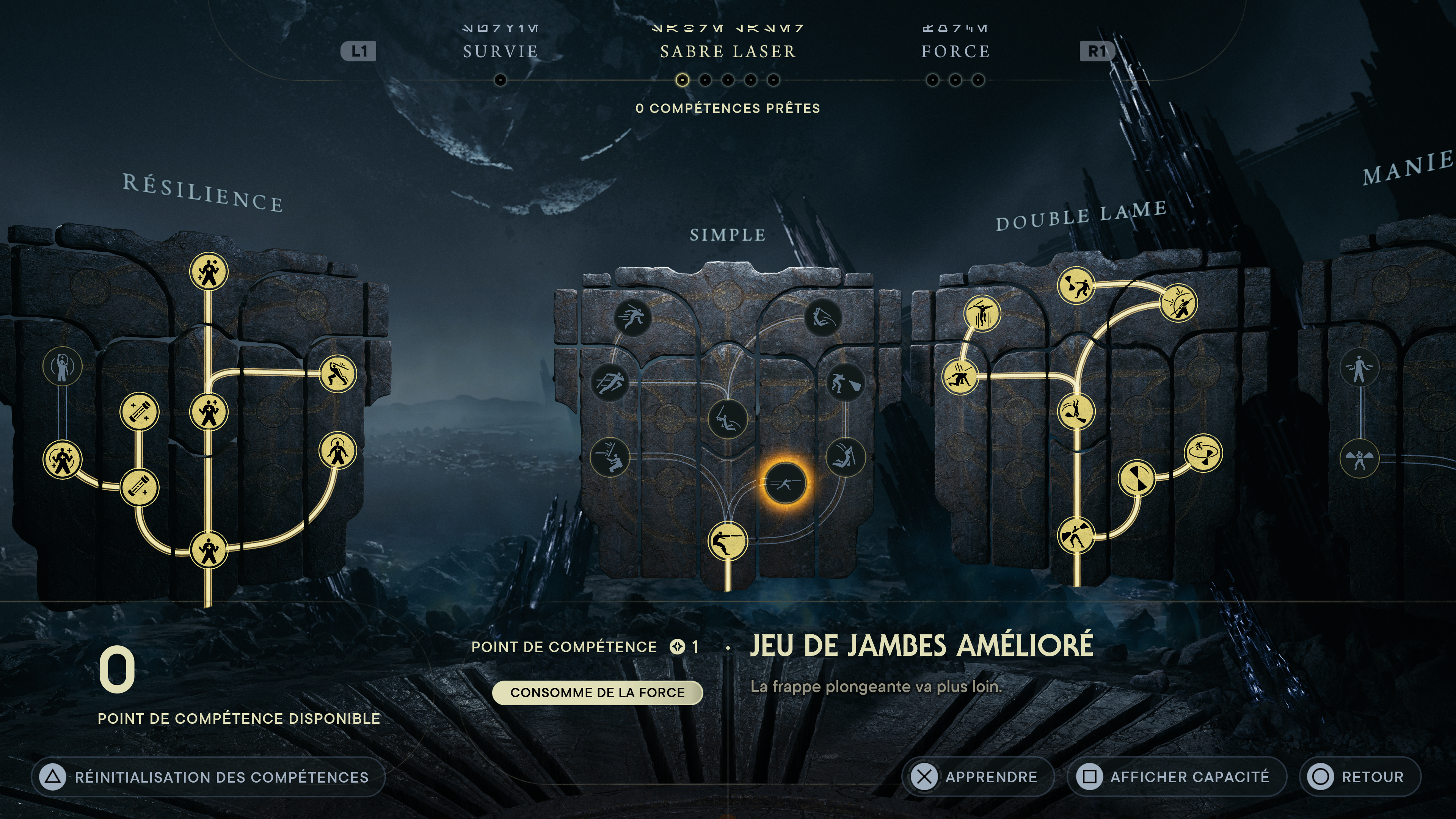 Pour commencer, ce que j’aime sur ce soft c’est son gameplay. Se prendre pour un Jedi, et se battre avec pour seules armes la force et un sabre laser, faut avouer que c’est assez séduisant ! Ici, vous aurez le choix de combattre avec un ou deux sabres sous différents styles, comme le sabre double et bien d’autres combinaisons (postures), pour ne pas trop vous spoiler. De plus vous pourrez débloquer de nombreuses compétences pour étoffer ce gameplay et franchement ça envoie du lourd !! L’Empire n’a qu’à bien se tenir, car vous allez en abattre des Stormtroopers !
