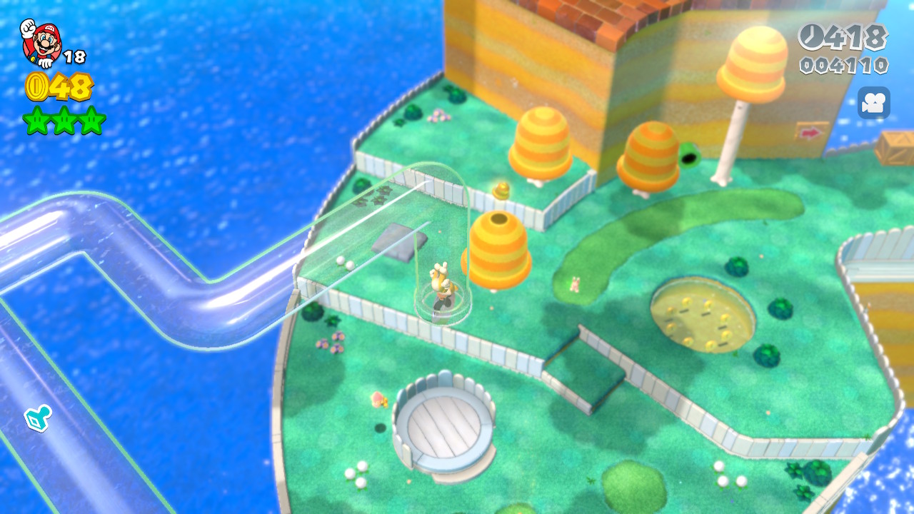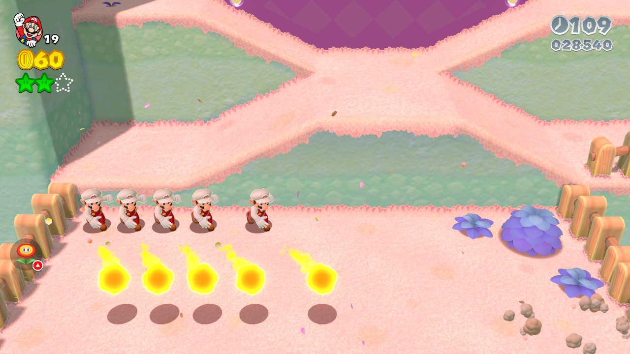 Comme dit précédemment, je n’ai pas eu l’occasion de m’essayé à ce titre sur WiiU, et c’est avec émerveillement que je prends part à l’aventure ! Avant tout, on va être honnête, on ne joue pas à un jeu Mario pour son scénario, bien que cette fois-ci, ce n’est pas la princesse Peach qui se fait enlevée, mais bel et bien des Fées qu’il vous faudra donc libérer. Le soft est un véritable régale à une exception près : Les imprécisions dues à la caméra éloignée ! Bien que l’on puisse se fier à l’ombre de notre personnage pour savoir où se placer quand on saute, il n’est pas toujours aisé de se situer dans cet environnement 3D… S’en suit une série de chutes involontaires dans le vide, qui ont tendance à m’agacer fortement ! (Bonjour au niveau « Gare aux grilles » en passant…) Ah ! Sachez qu’il est tout de même possible de bouger l’angle de la caméra, mais sur le joy-con droit, on a tendance à bouger le joystick sans le vouloir, ça m’est arrivé plusieurs fois et cela peut être assez frustrant… Autrement, le level-design est vraiment génial et les nombreux niveaux sont variés. Le tout regorge de multiples secrets, je regrette parfois qu’il y ai un chronomètre tellement j’adore fouiner un peu partout. Le soucis étant que le soft soit un peu trop facile, et sans chrono, il n’y aurait pas de réel challenge.