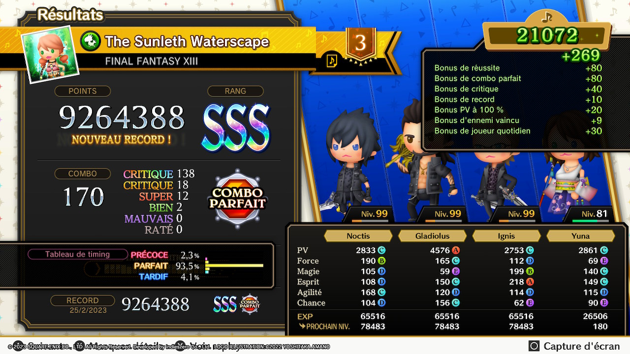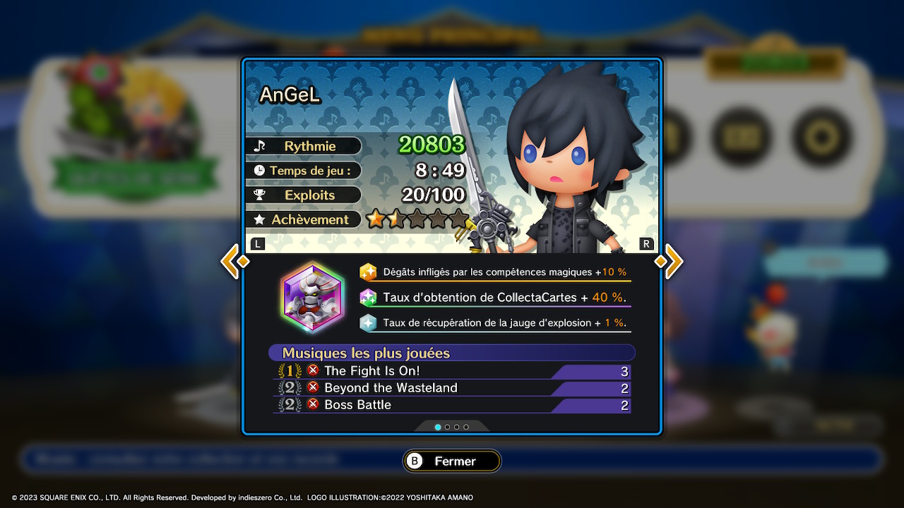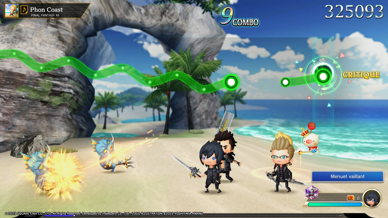 Le contenu à débloquer y est dantesque !! Bon, on ne joue clairement pas à Theatrhythm pour ses graphismes, mais le tout se veut mignon, avec ses petits personnages FF en chibies. Les menus sont clairs et bien présentés et l’ensemble de l’œuvre est tout simplement très attractif, voir addictif à souhait ! Dommage qu’il manque quelques musiques, et que certaines autres ne soient pas disponibles dans leur totalité. Enfin… On lui pardonnera assez vite ces petits manques, car au final le titre est tellement sympathique qu’on en voudra toujours plus. Un excellent soft à posséder pour les fans de la saga, ou pour les amoureux du genre.