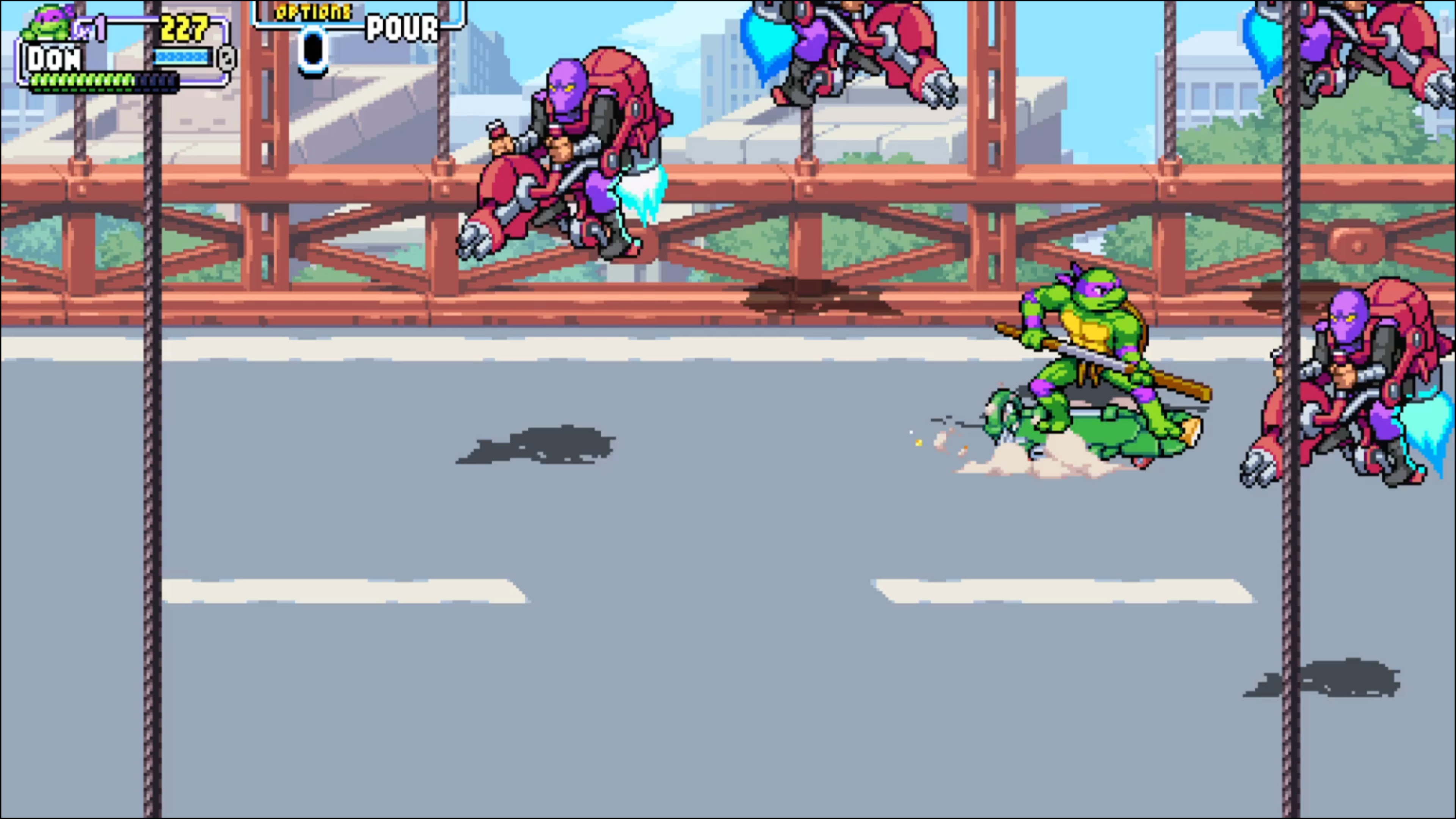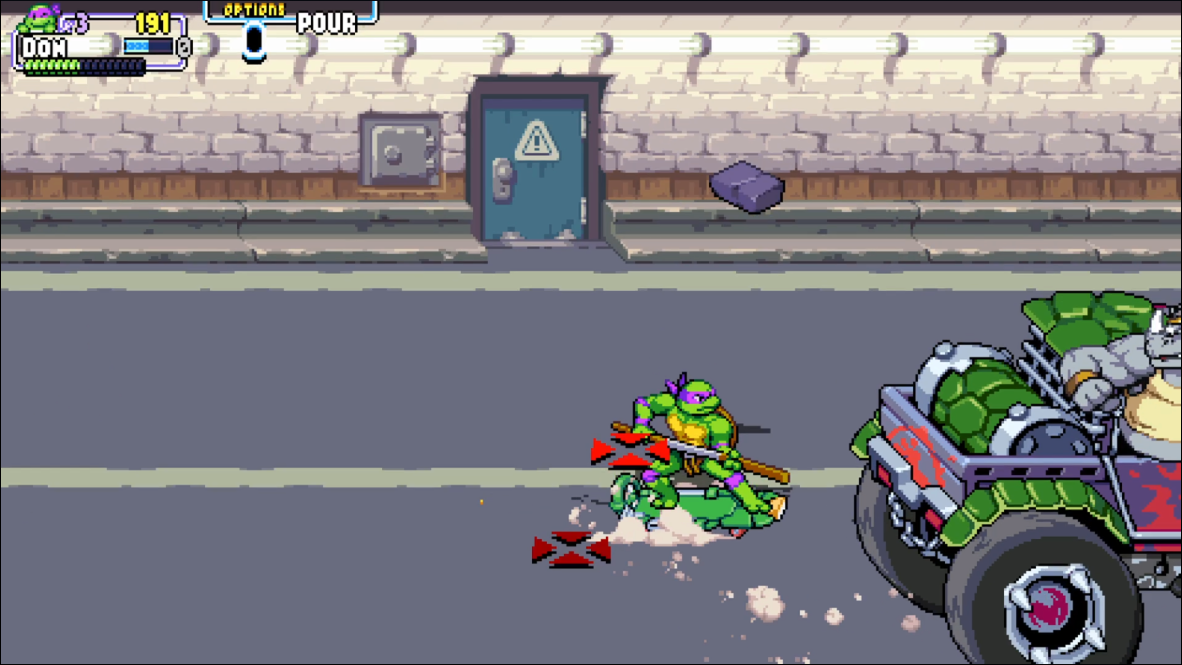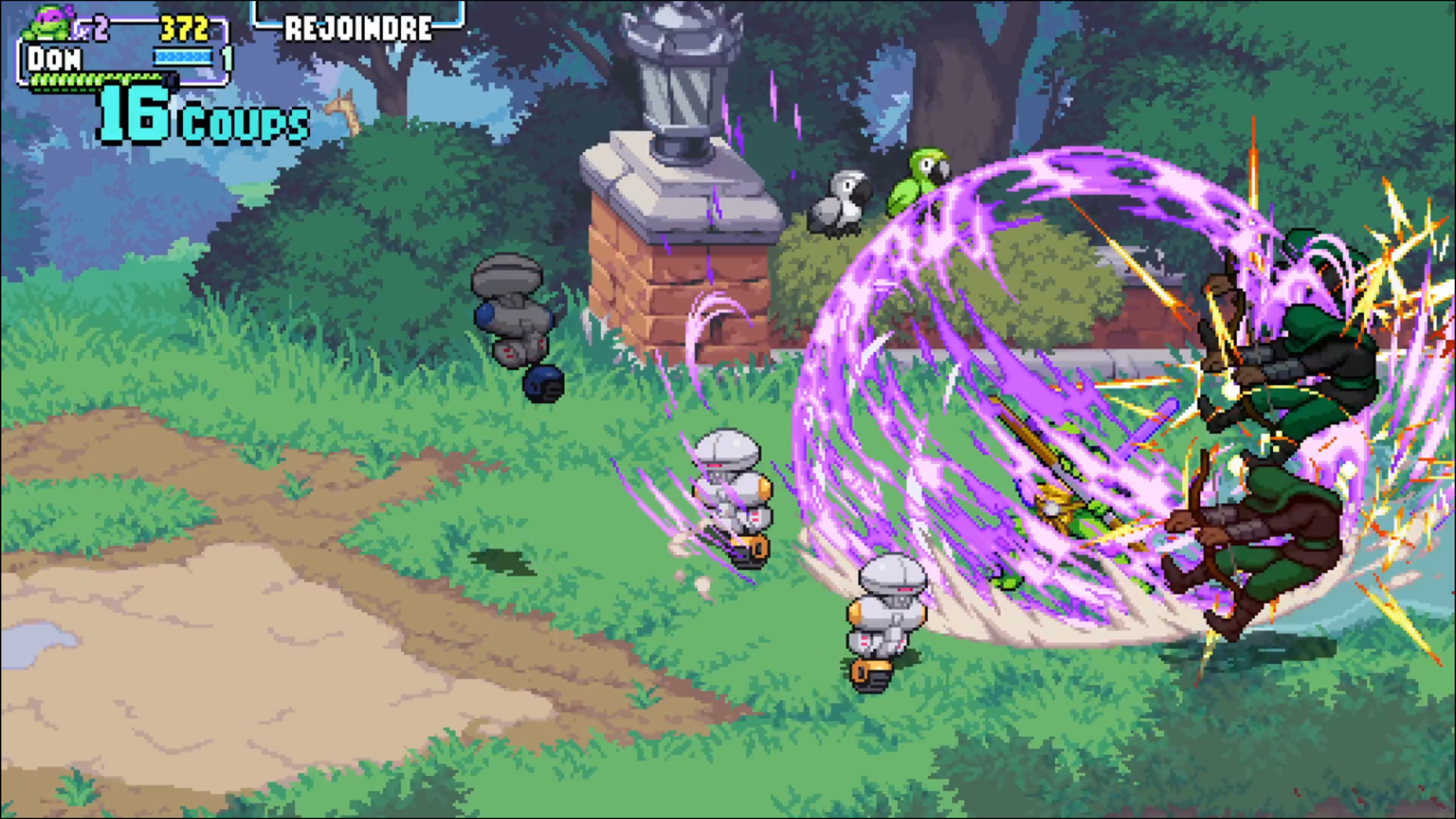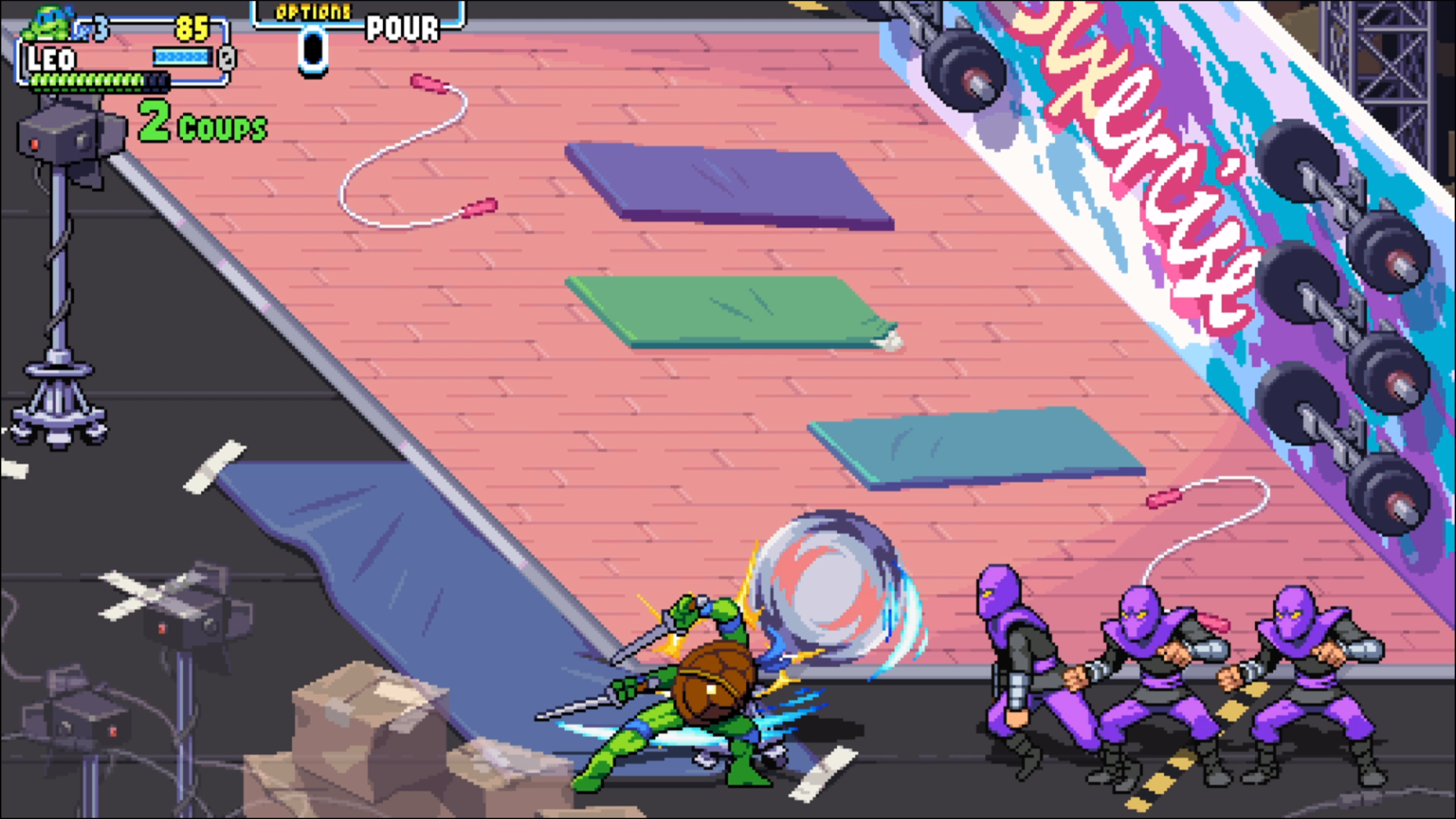 Tout commence par une cinématique à l’ancienne, qui (pour les plus anciens d’entre nous) vous rappellera très certainement le dessin animé des Tortues Ninjas des années 90. De quoi raviver la flamme de la nostalgie chez les joueurs, d’autant plus que cette cinématique est accompagnée de la musique officielle ! Tout ceci laisse à penser que le titre rendra un bel hommage à la saga TMNT… Et effectivement, dès les premiers instants de jeu, on plonge dans un univers très coloré aux graphismes en pixel art, avec un gameplay fun et nerveux, proche de ce qui se faisait à l’époque.