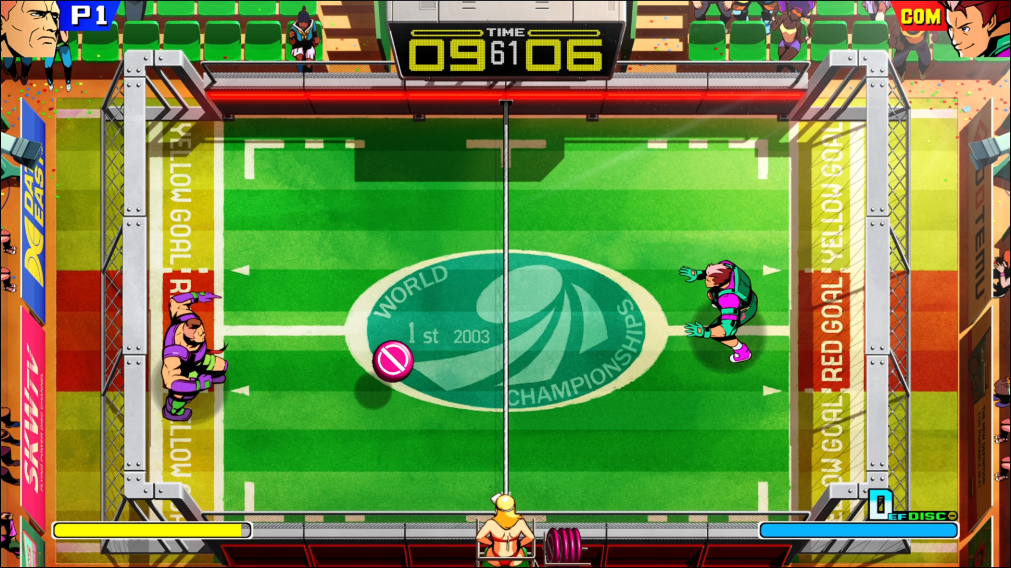 Tout d’abord, ce qui me plait dans ce jeu ce sont ces graphismes 2D faits à la main qui donnent un rendu assez unique au soft. Choisissez votre personnage parmi un casting varié de 10 champions et affrontez vos adversaires sur différents terrains, dont certains ont des spécificités, ce qui ajoute un peu de piment aux parties. Son gameplay est nerveux, et pas aussi simple à prendre en main qu’il n’y paraît… Ce, à cause de l’attribution des touches, selon moi. Par exemple, le dash pour glisser vers la zone où va atterrir le frisbee correspond à la touche pour lancer ledit objet. Donc il m’arrive très souvent d’être bien placé et de dasher vers une autre direction, tout cela pour avoir appuyé un peu trop tôt sur la touche. Et c’est frustrant !